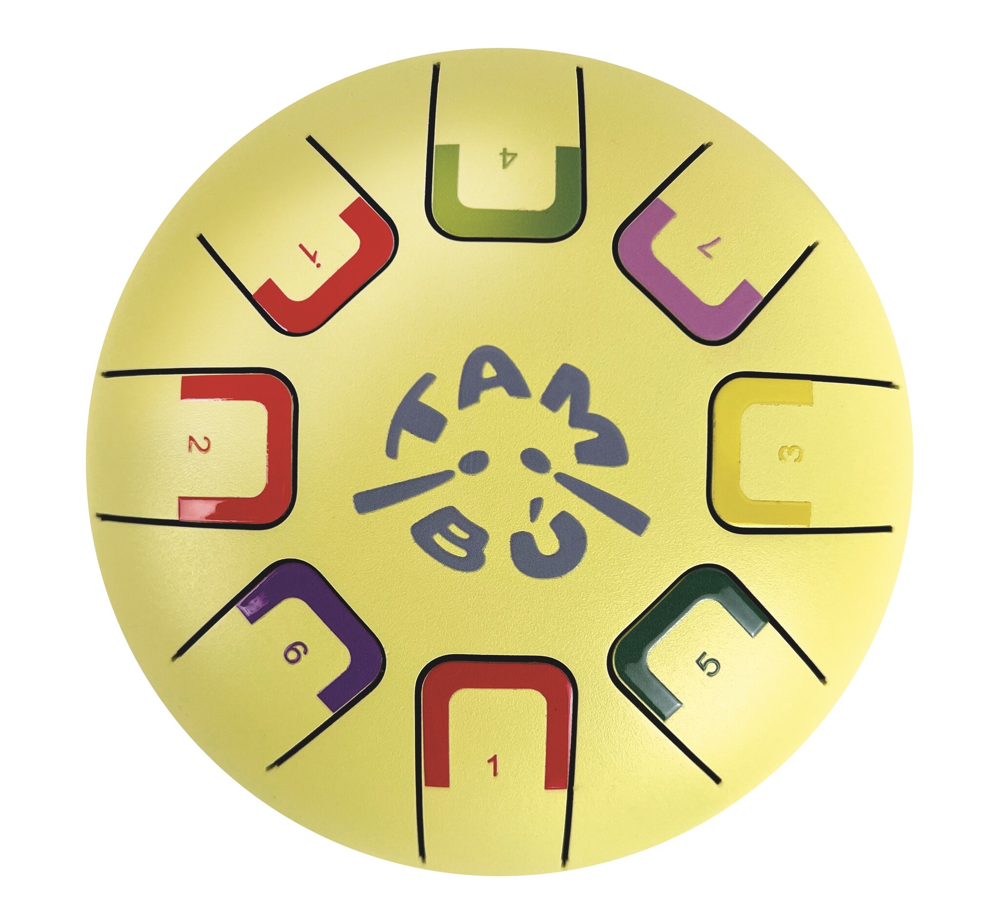 Goed klinkende kleine Tambú tongdrum of handpan met acht tonen in een duidelijke aftekening om mooie muziekstukken te leren spelen in prachtige zonnig gele kleur Lees meer
