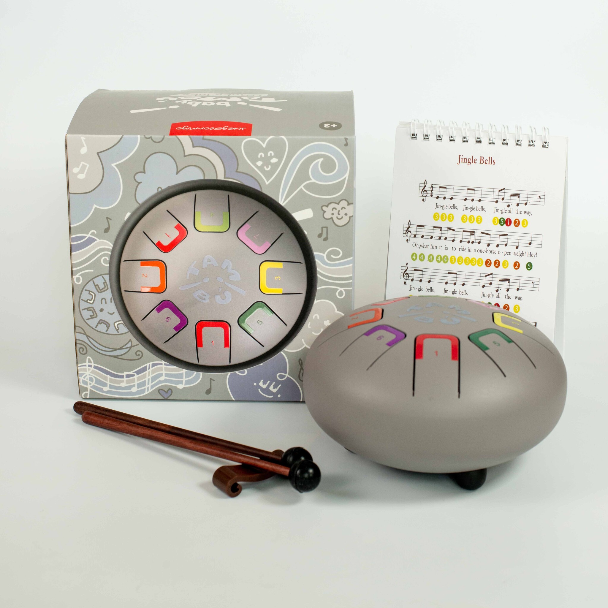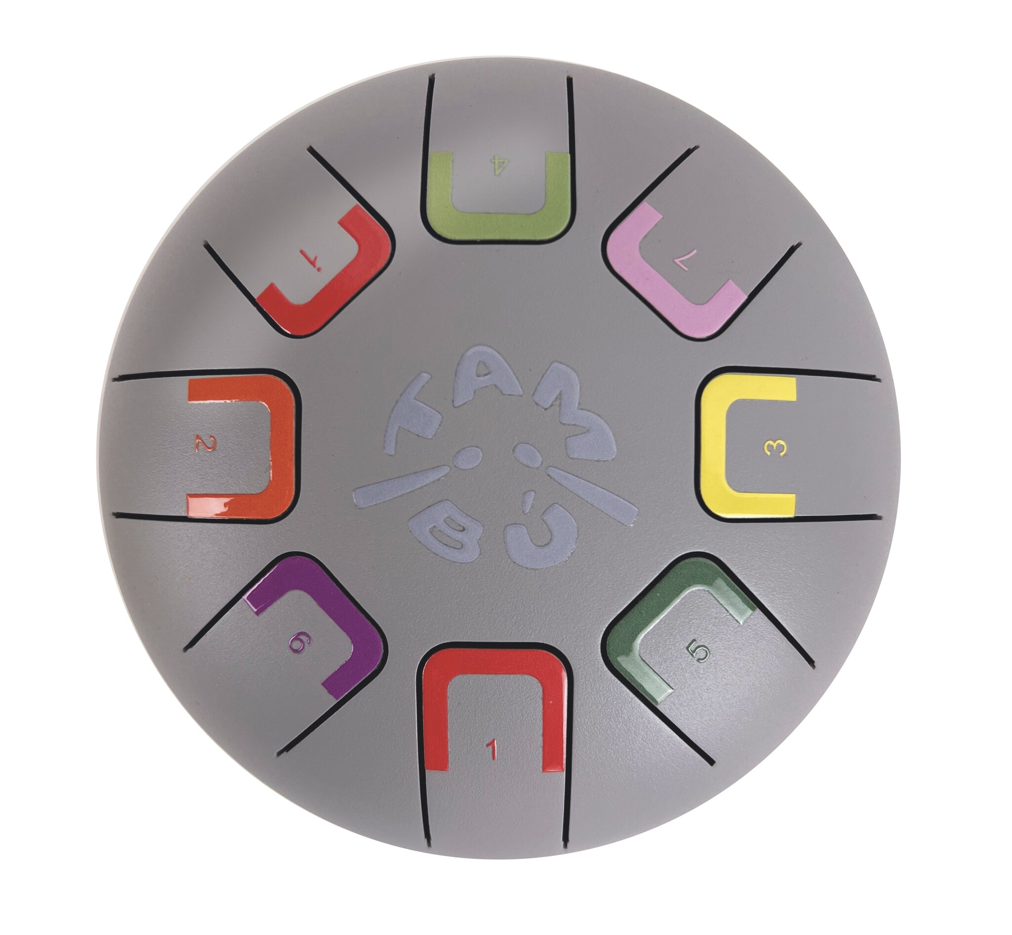 Goed klinkende kleine Tambú tongdrum of handpan met acht tonen in een duidelijke aftekening om mooie muziekstukken te leren spelen in prachtige rookgrijze kleur Lees meer