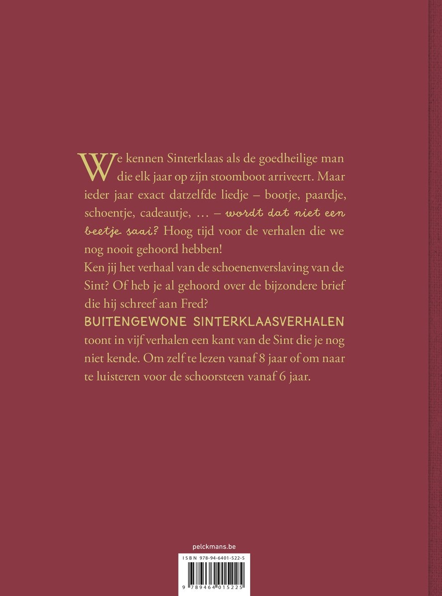 Ken jij het verhaal van de schoenenverslaving van de Sint? Of heb je al gehoord over de bijzondere brief die hij schreef aan Fred? Buitengewone sinterklaasverhalen toont in vijf verhalen een kant van de Sint die je nog niet kende. Om zelf te lezen vanaf 8 jaar of om naar te luisteren voor de schoorsteen vanaf 6 jaar.