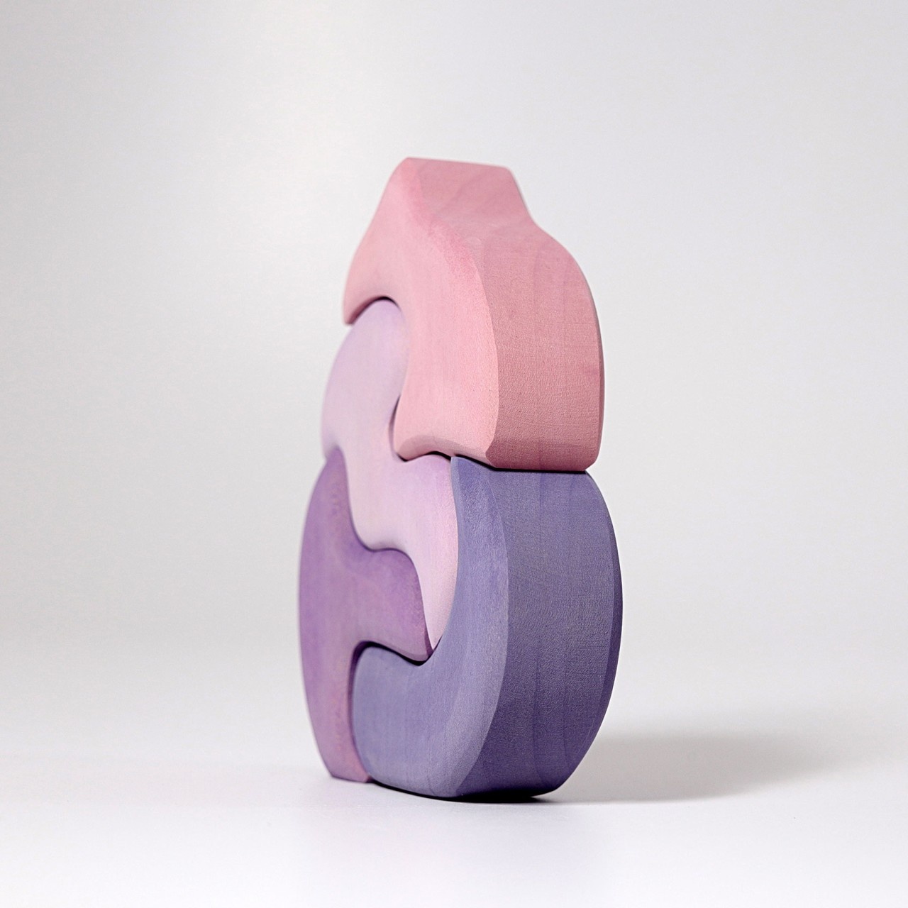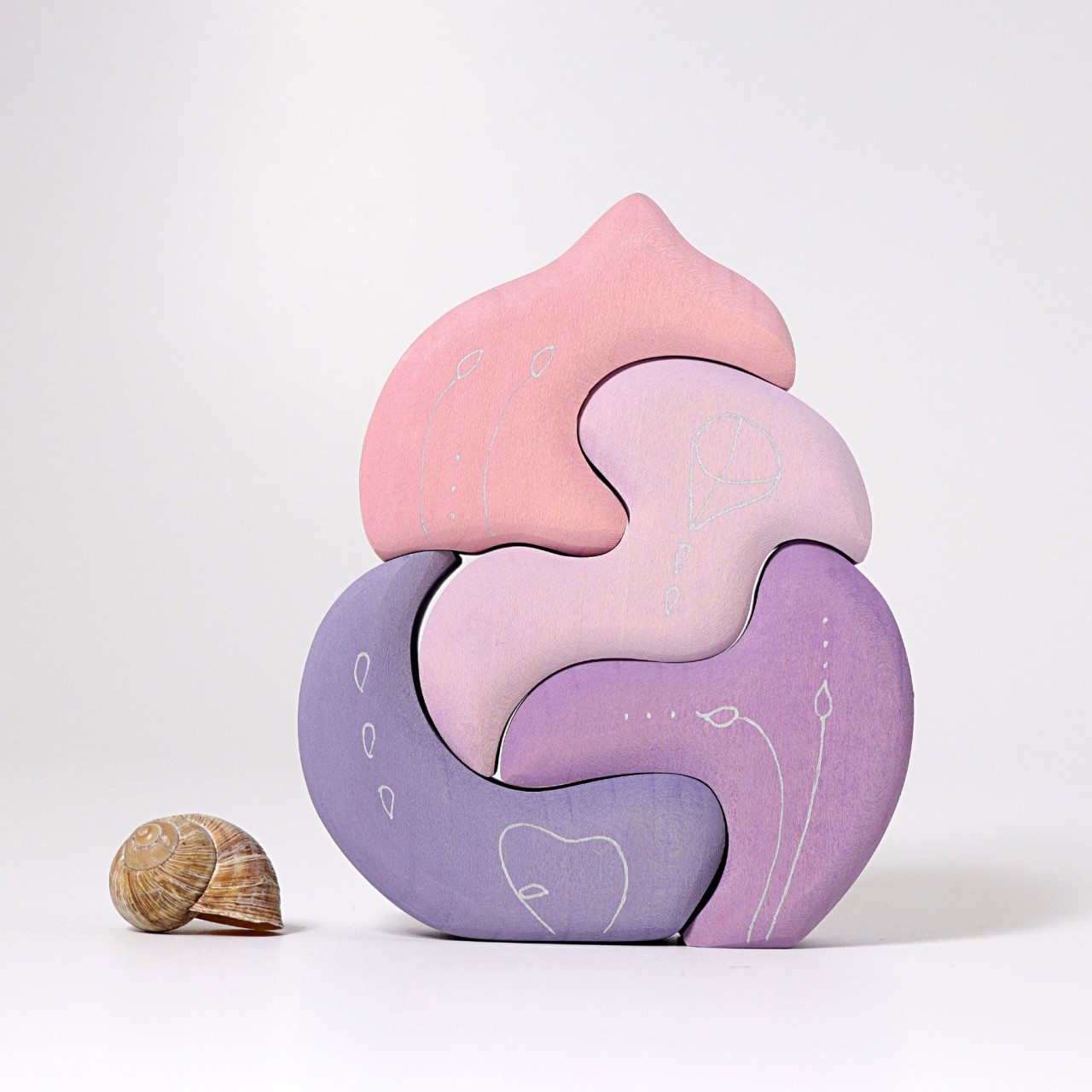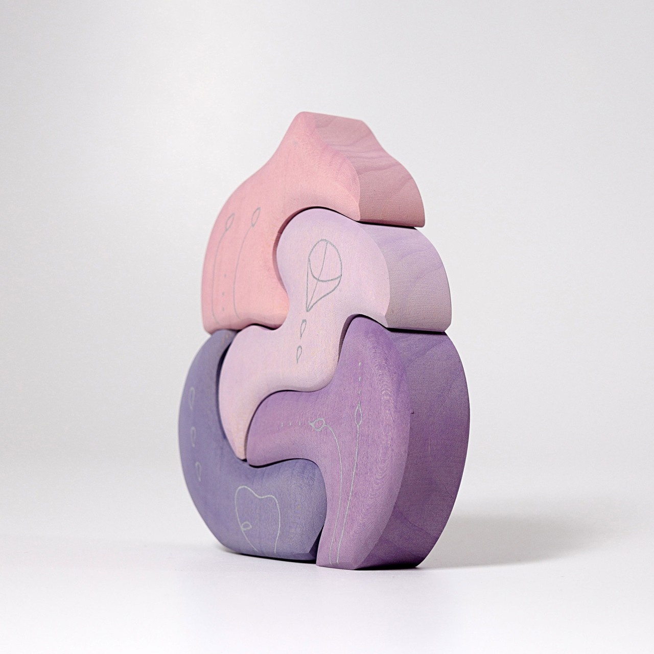 Dit sprookjesachtige fantasiehuisje bestaat uit 4 mooie afgeronde elementen in mooie zachte pastel roze kleuren. Op de elementen zijn mooie handgeschilderde decoraties aangebracht. Ideaal te combineren met andere Grimm's fantasiehuisjes en bouwblokken.