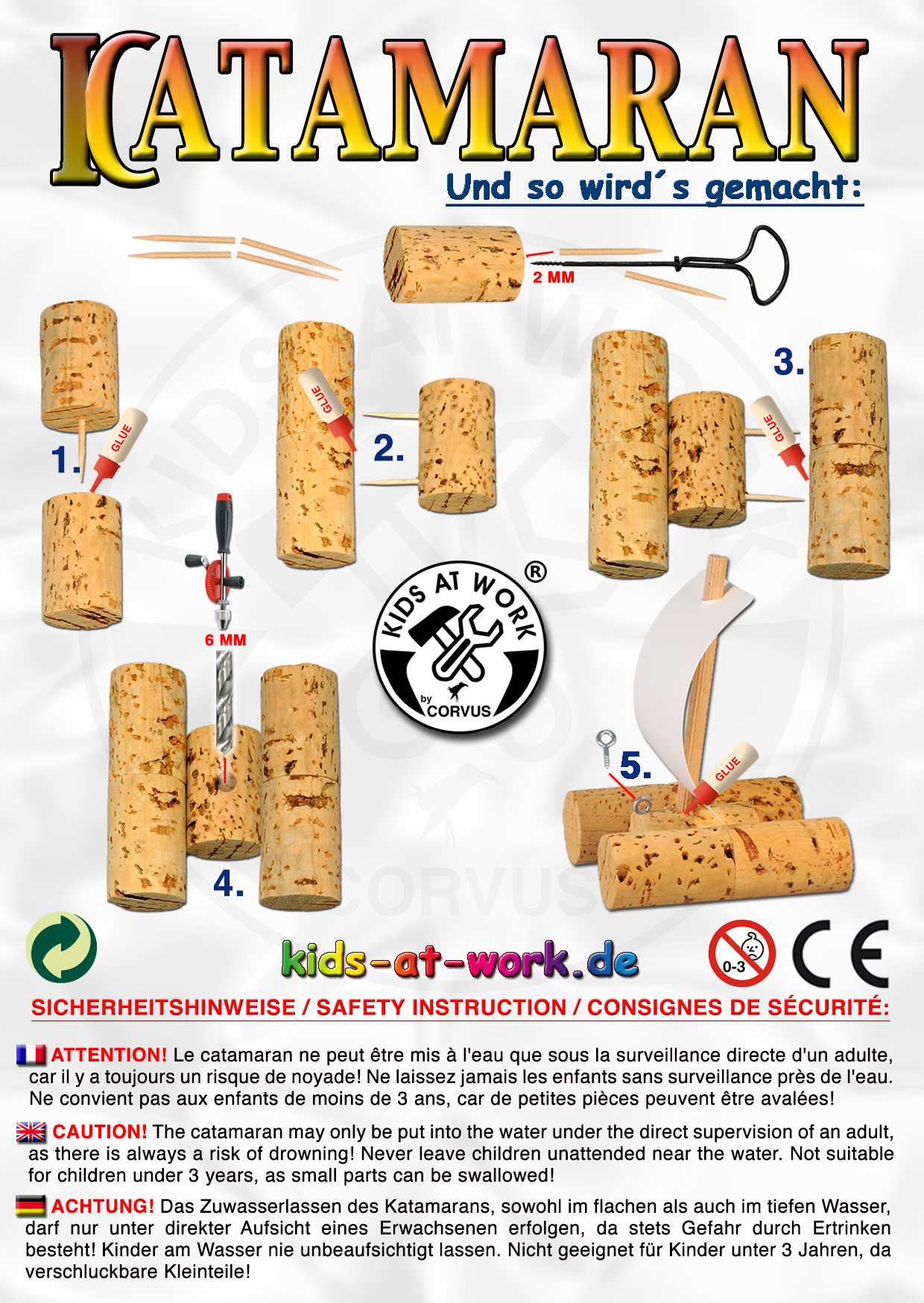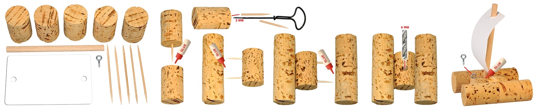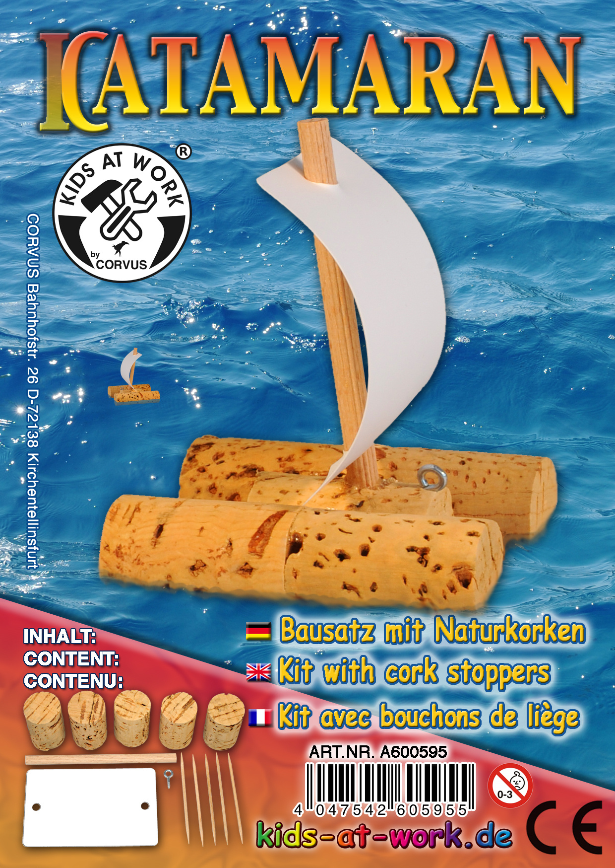 Dit leuke kleine knutselpakketje is ideaal voor tussendoor. Knutselen met kurken kan eindeloos met extra gevonden materiaal uit de natuur of je keukenkastje. De catamaran heeft een bijgeleverd zeiltje. Koop extra wat kleine boortjes, zoals de diverse kastanjeboortjes en eventueel wat lijm en je kunt lekker spelen. Kurk drijft, dus dit bootje kan ook echt varen in water. Probeer eens in bad, in de gootsteen, een teiltje of aan de waterkant. Het zeiltje is overschilderbaar of kun je met wasco en stiften inkleuren. Hoogte 10,5 cm