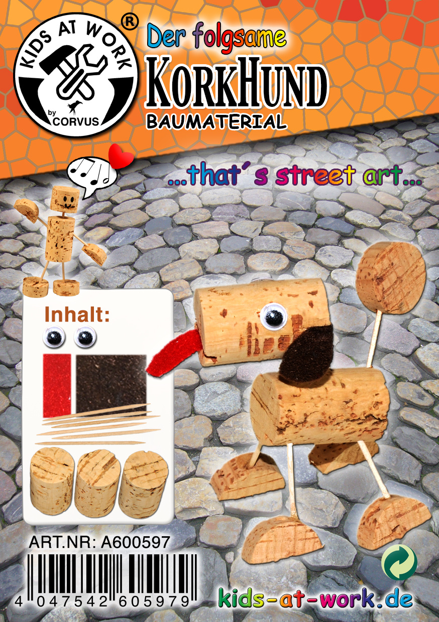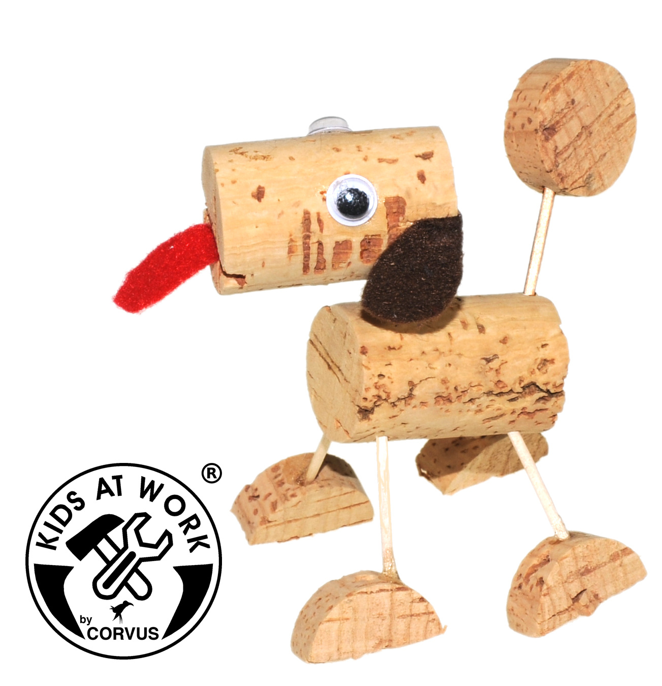 Dit leuke kleine knutselpakketje is ideaal voor tussendoor. Knutselen met kurken kan eindeloos met extra gevonden materiaal uit de natuur of je keukenkastje. De hond maak je helemaal zelf. Koop extra wat kleine boortjes, zoals de diverse kastanjeboortjes en eventueel wat lijm en je kunt lekker spelen. Kurk drijft, dus dit hondje kan misschien wel zwemmen. Probeer eens in bad, in de gootsteen, een teiltje of aan de waterkant wat je met kurken kunt doen.