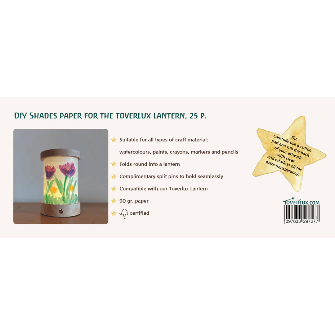 Deze set bevat 25 papieren Toverlux-lampenkappen (lantaarnpapier voor in de Toverlux lantaarn), compatibel met al je favoriete kunstmaterialen: aquarelverf, verf, kleurpotloden, potloden of stiften