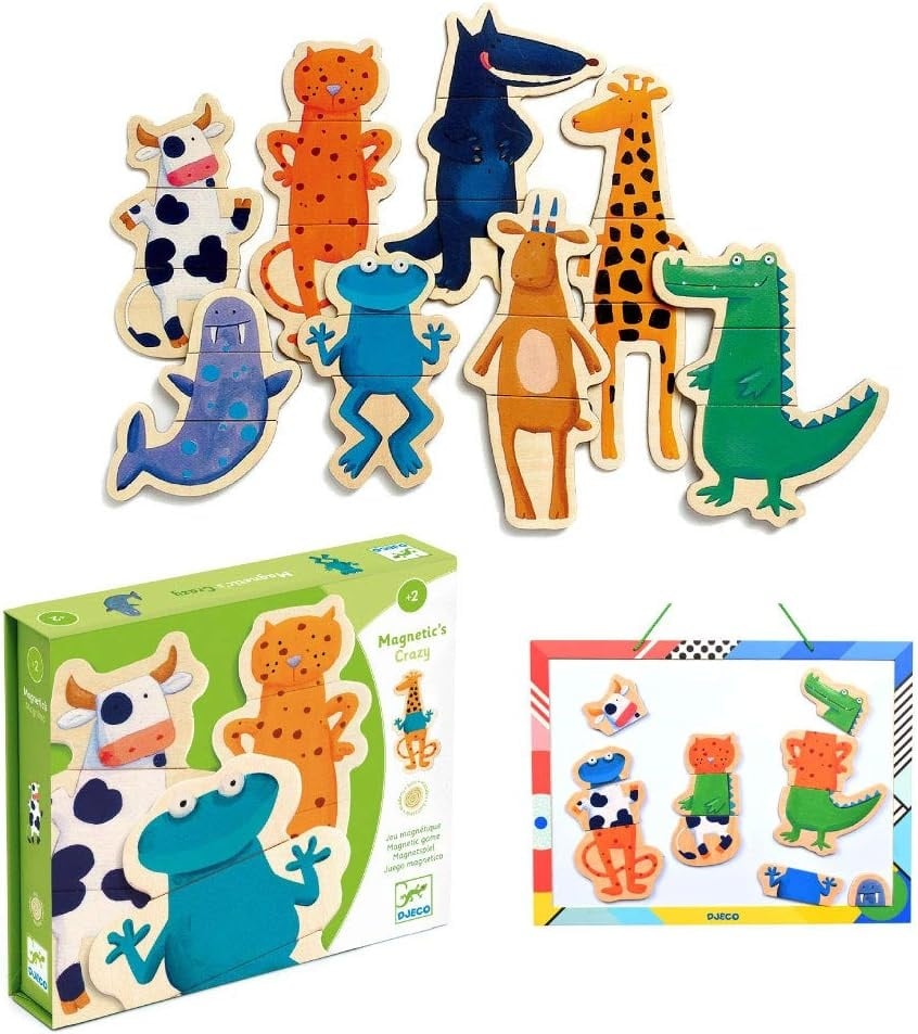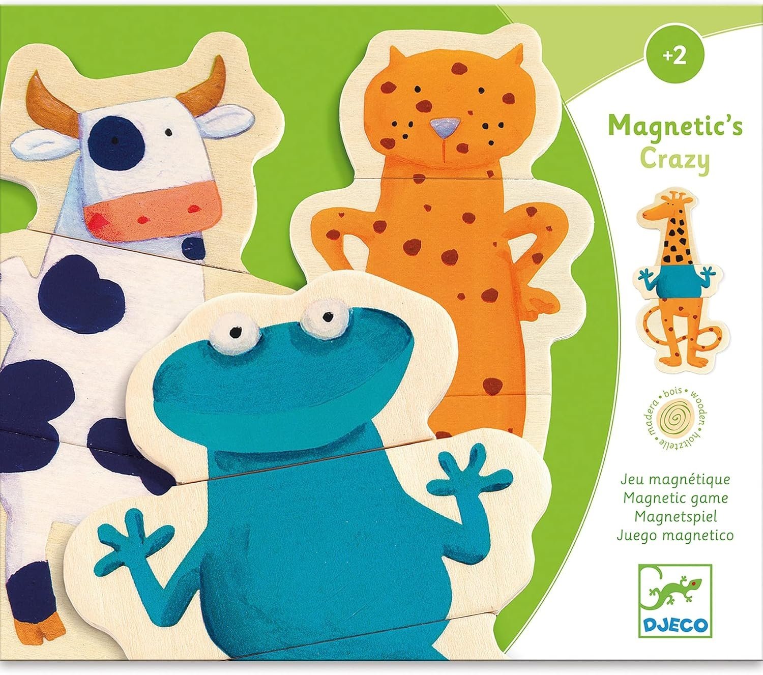 Met de Djeco Magnetics Crazy Animals wordt spelen een creatief avontuur! Deze vrolijke magnetische puzzelset bestaat uit 24 houten stukjes waarmee kinderen acht verschillende dieren kunnen samenstellen – of juist hun fantasie de vrije loop laten en de gekste combinaties bedenken.