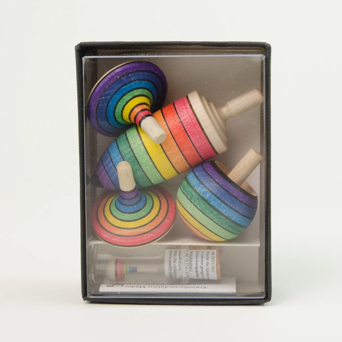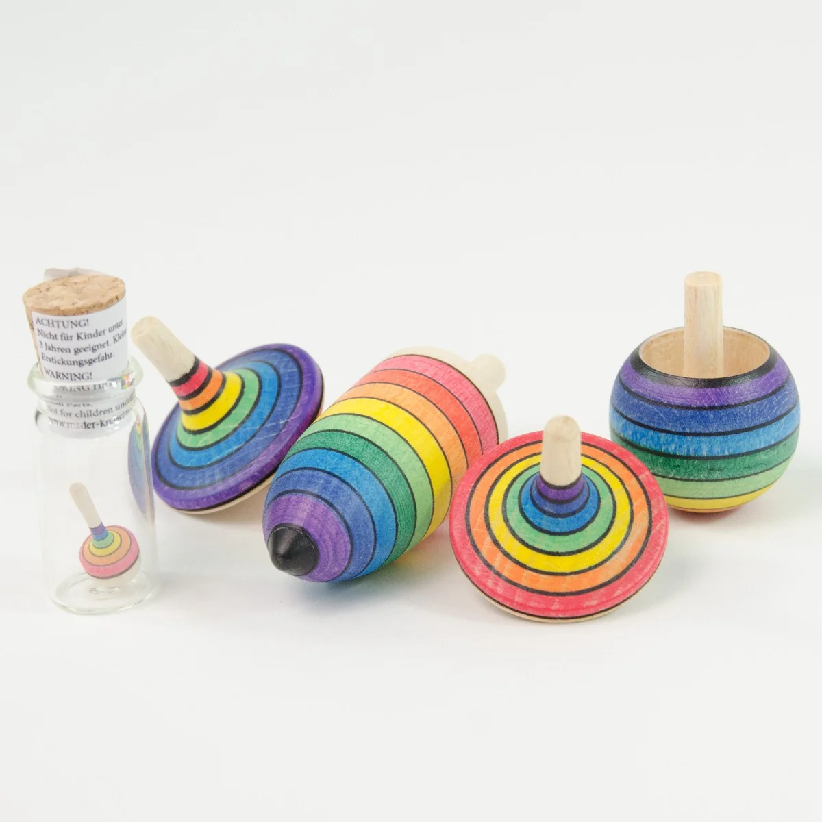 Met deze set van 5 handgemaakte houten tollen in vrolijke regenboogkleuren met een moeilijkheidsgraad variërend, van makkelijk (1) tot moeilijk (6), leer je steeds behendiger worden en train je jouw motorische vaardigheden.