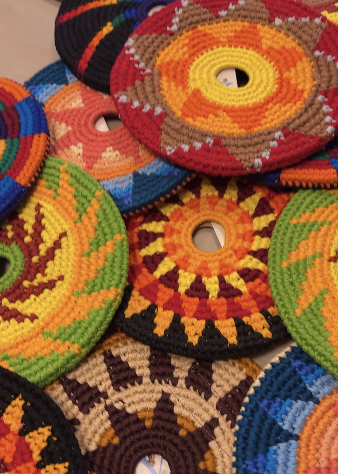 De frisbees zijn met de hand gemaakt door vrouwen uit Guatemala. Fair Trade ook en uniek waardoor de maten (maximaal cm verschil) en patronen verschillen van elkaar. De vrouwen hebben een extra inkomen om in hun primaire levensbehoefte te kunnen voorzien.