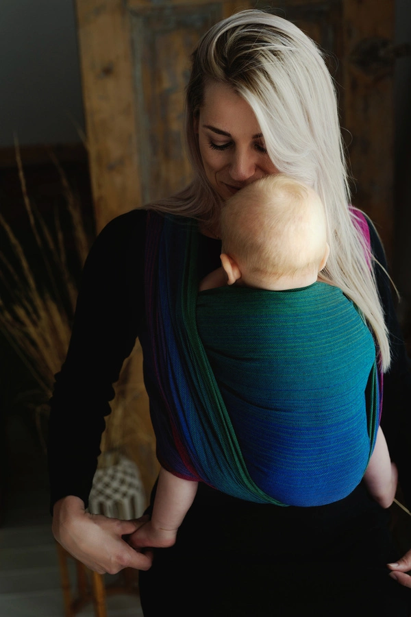 Wat de Zircon draagdoek echt beginnersvriendelijk maakt, zijn de gekleurde randen, die het aantrekken en aanpassen veel gemakkelijker maken – vooral bij het leren knopen. De combinatie van diepe, elegante kleuren (blauw, groen, violet, zwart) geeft de draagdoek een stijlvolle en veelzijdige uitstraling die bij elke outfit en gelegenheid past.