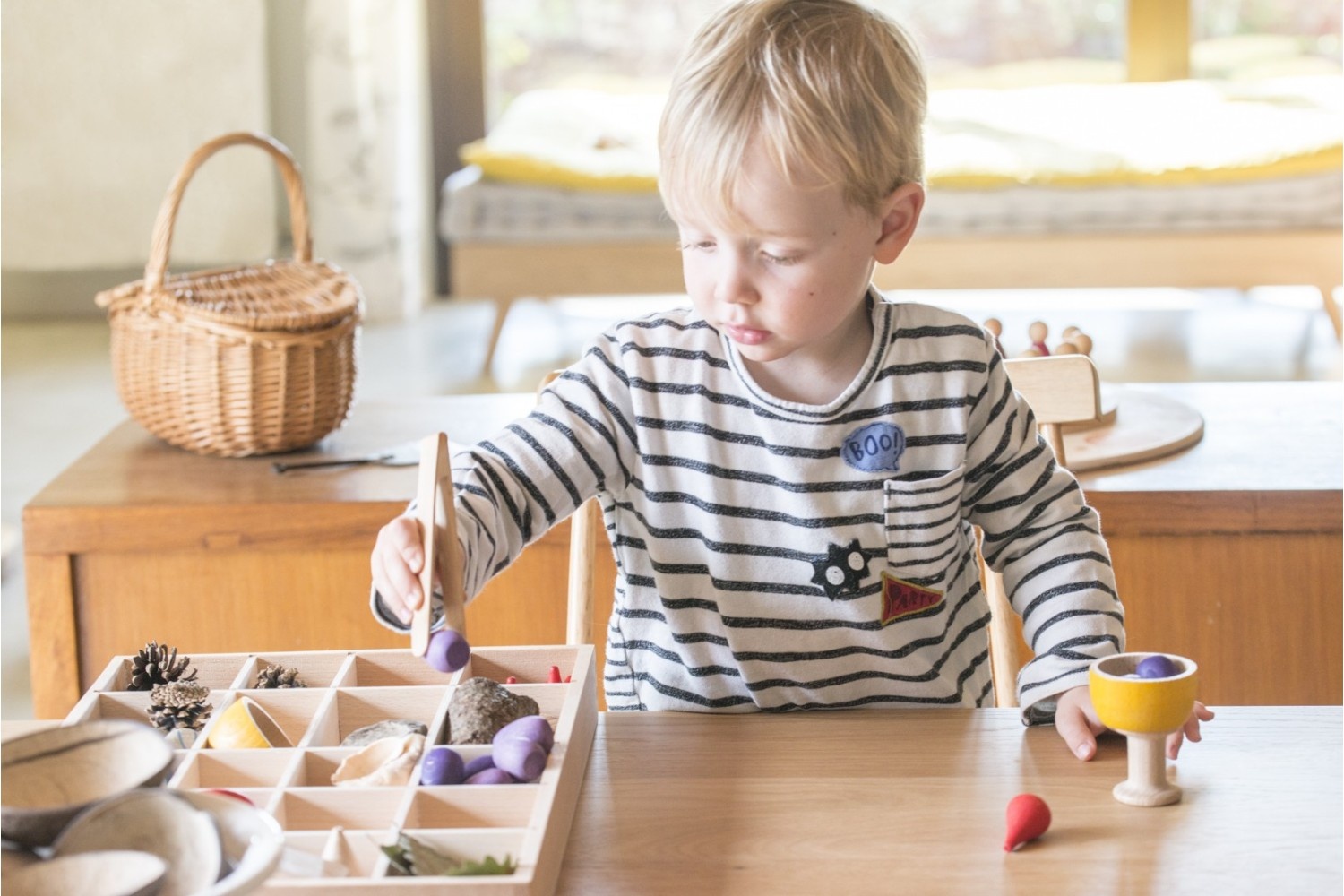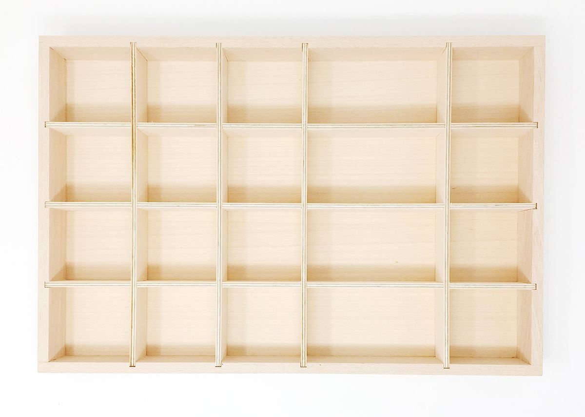 Volgens Reggio Emilia zijn orde en schoonheid essentieel, omdat georganiseerd materiaal uitnodigt tot en momenten van kwalitatief spel creëert. Deze bak met vakjes biedt de mogelijkheid om tegelijkertijd een grote verscheidenheid aan materialen aan te bieden.De vakjes houden de materialen bij elkaar en beperken ze, zodat kinderen alle kleine elementen in hun omgeving kunnen sorteren en ordenen.
