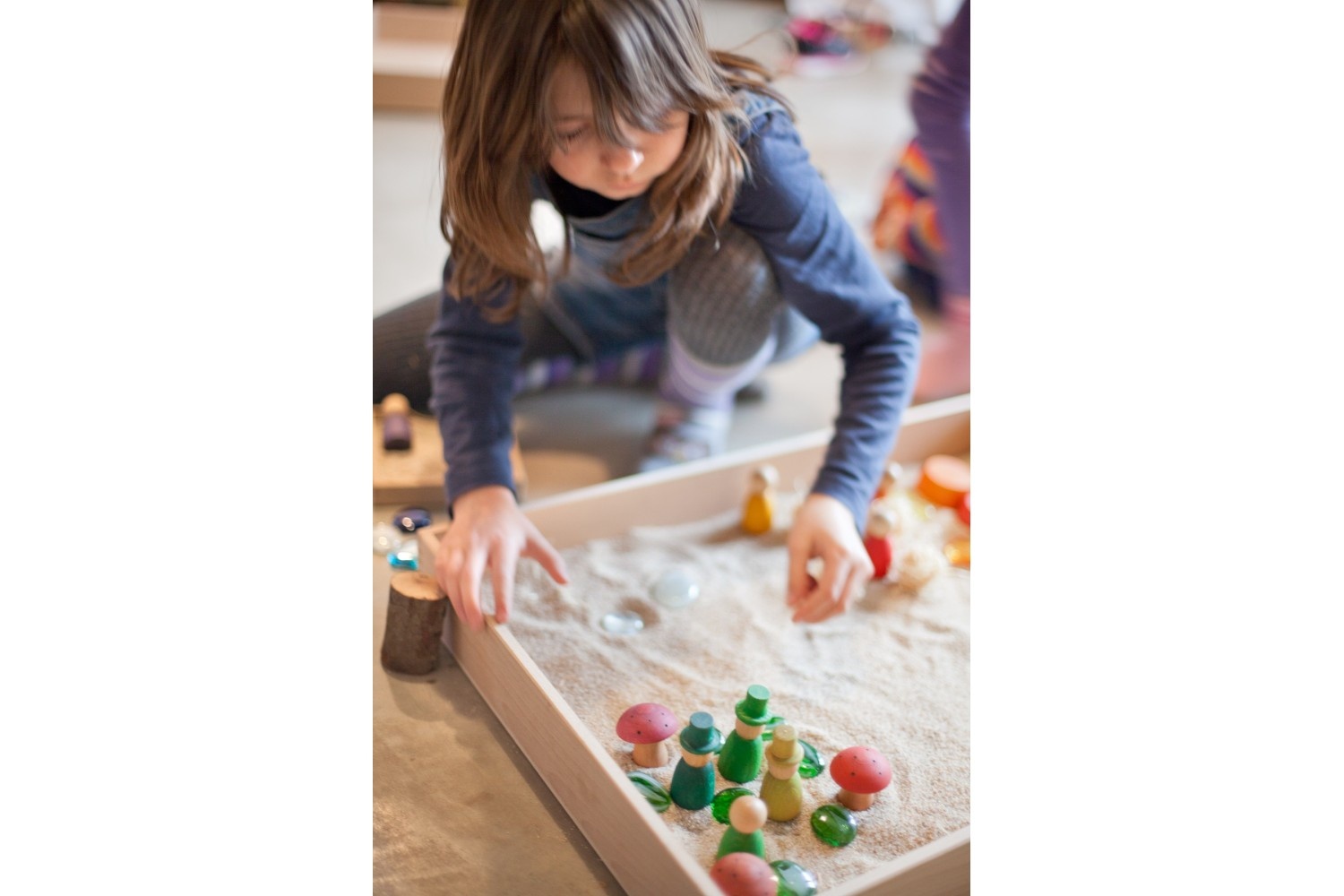 De bak wordt brvordert zintuiglijk spel wanneer deze gevuld is met zand, meel, zout, rijst, enz. Op de achtergrond zijn enkele gestempelde afbeeldingen te zien die de vier elementen van de natuur afbeelden: aarde, water, lucht en vuur. Deze elementen verbinden ons met de natuur.