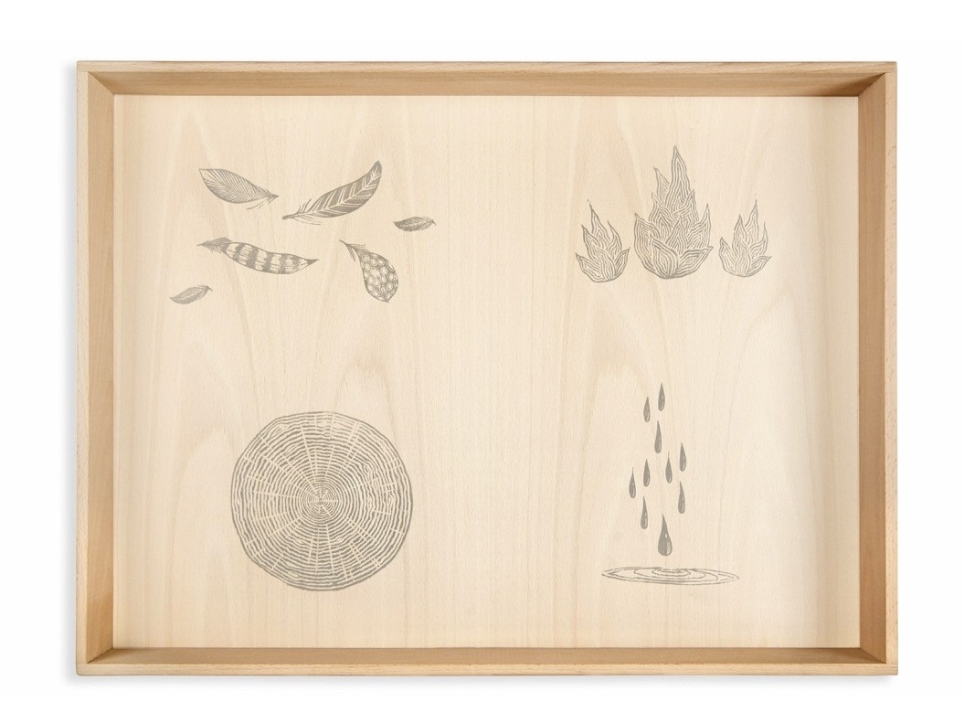 Een houten bak van beukenhout (45 x 65 x 7 cm) met de vier elementen van de natuur er handgemaakt op gestempeld. Deze bak biedt een perfecte afbakening voor creaties met allerlei materialen.
