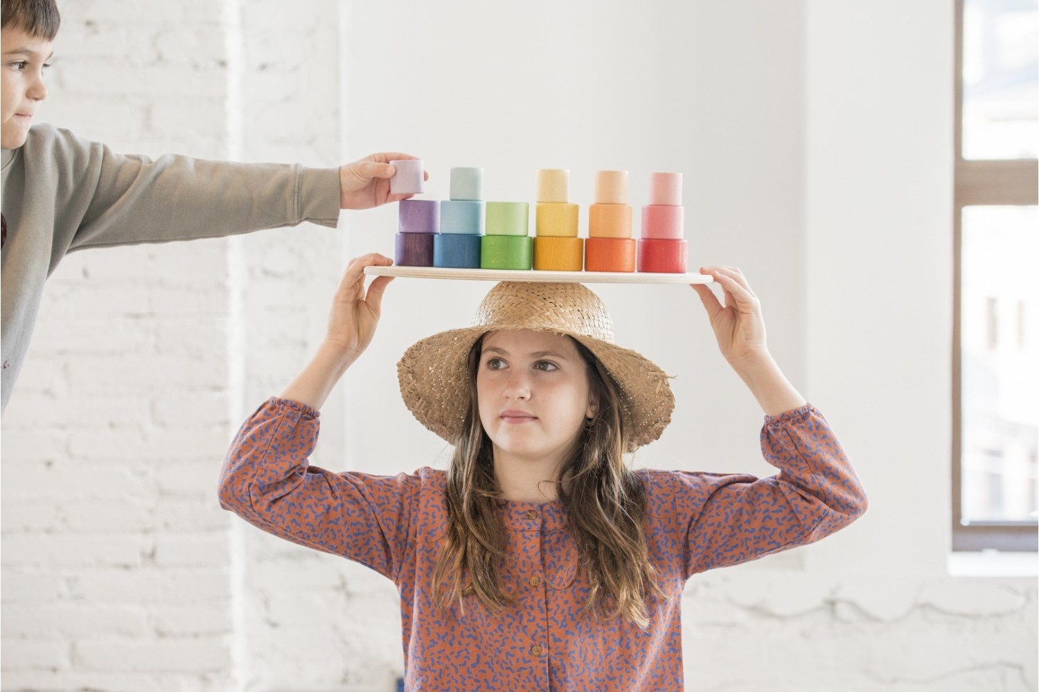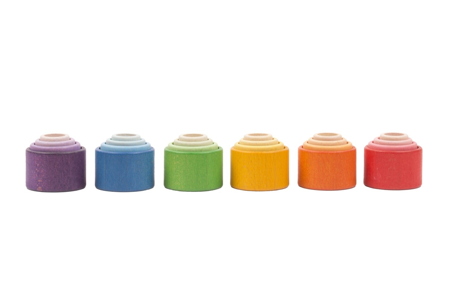 24 regenboognestjes in vier verschillende maten en 6 verschillende kleurschakeringen.Elke kleur bevat 4 kommen waarvan de tint geleidelijk overgaat van helder naar licht.Je kunt het spel aanvullen met vullen en legen, overbrengen en laden, verstoppen en ontdekken... Met deze kommen van verschillende groottes kun je ook werelden van torens, kleuren en constructies creëren, schatten verstoppen als kleine doosjes of zelfs de ene kom in de andere rollen.Deze 24 kommen bieden een grote variatie aan speelmogelijkheden.Dankzij de veelzijdigheid van het materiaal zijn er talloze spelletjes mogelijk.