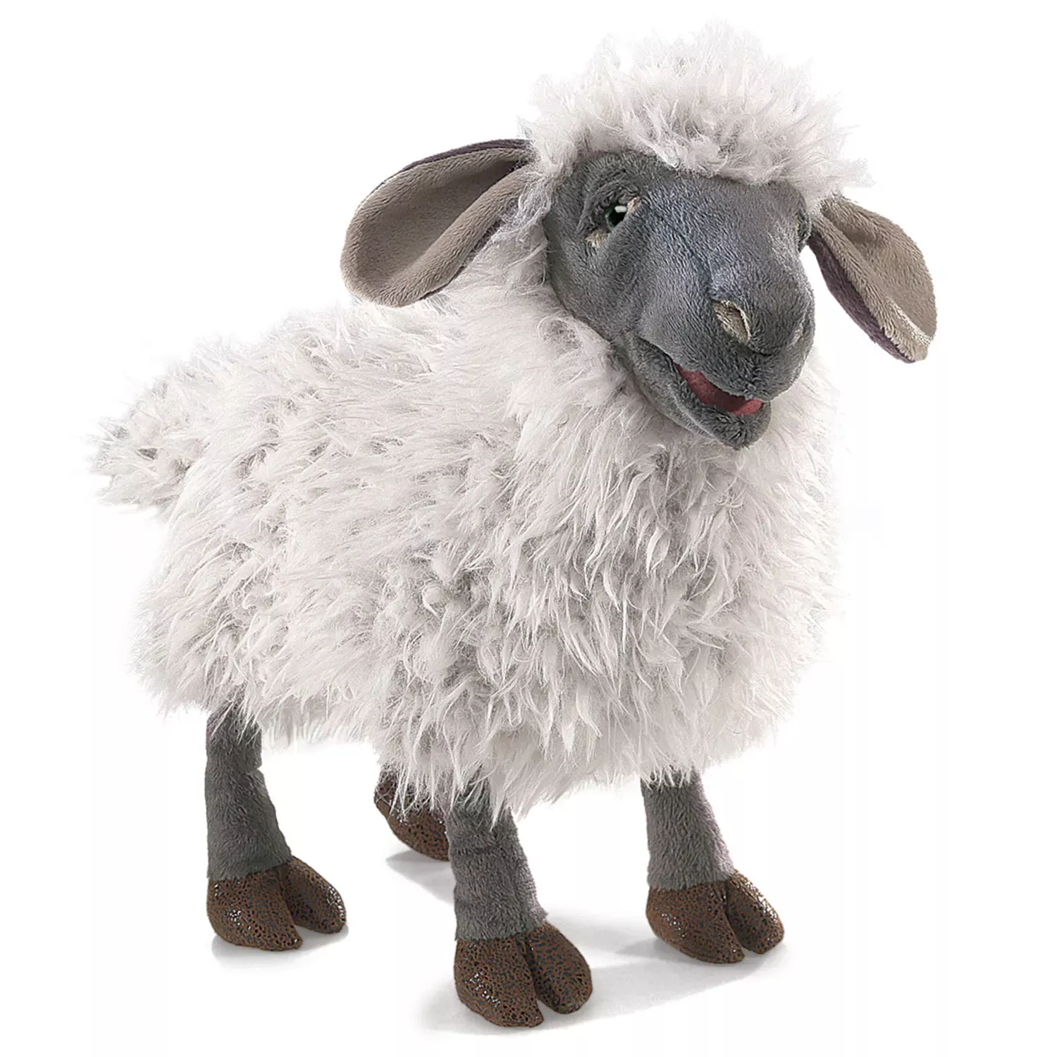 Dit schaap graast in de groene weiden. Met haar lieve, komische gezichtje en zachte, zilverkleurige vacht zal deze handpop-"ooi" vast en zeker in de smaak vallen.