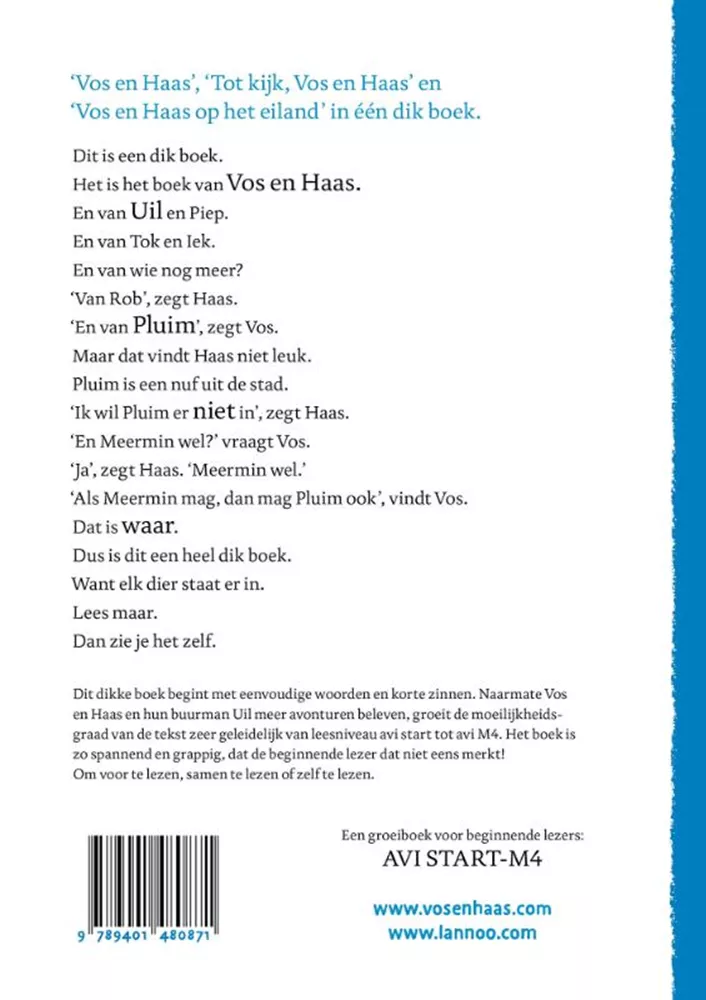 Dit dikke boek begint met eenvoudige woorden en korte zinnen. Naarmate Vos en Haas en hun buurman Uil meer avonturen beleven, groeit de moeilijkheidsgraad van de tekst zeer geleidelijk van leesniveau AVI start tot AVI M4.
