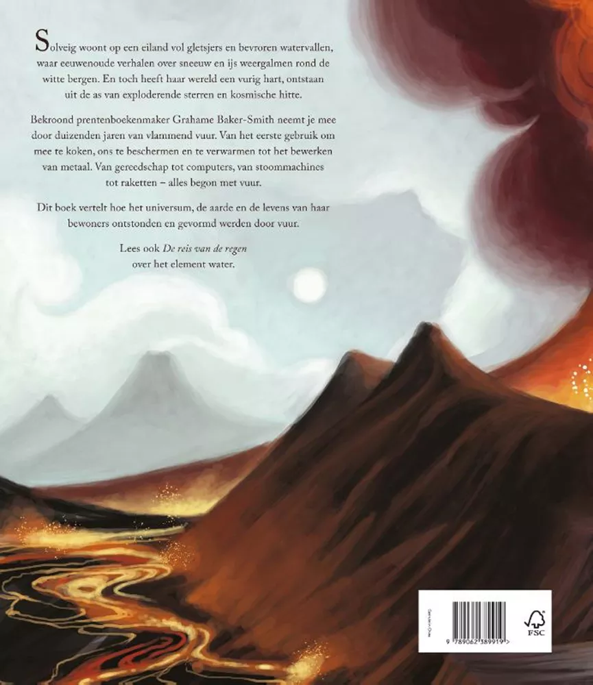Bekroond prentenboekenmaker Grahame Baker-Smith neemt je mee door duizenden jaren van vlammend vuur. Van het eerste gebruik om mee te koken, ons te beschermen en te verwarmen tot het bewerken van metaal. Van gereedschap tot computers, van stoommachines tot raketten – alles begon met vuur. Dit boek vertelt hoe het universum, de aarde en de levens van haar bewoners ontstonden en gevormd werden door vuur.