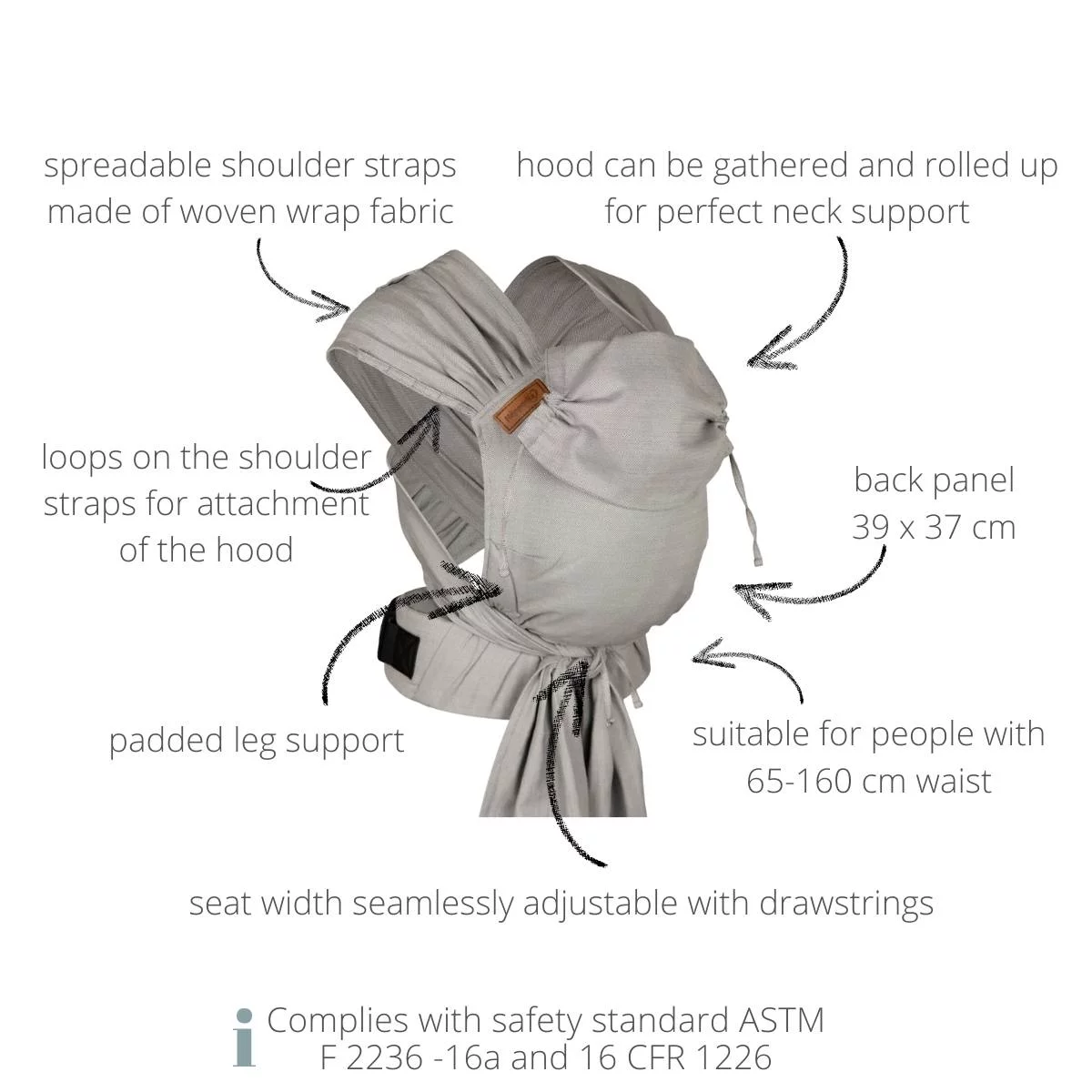 Met zijn strakke design en perfecte ergonomie is hij ideaal voor pasgeborenen en groeit hij met je kind mee tot het einde van de draagleeftijd. Draagzakken met halve gespen zijn bijzonder gemakkelijk aan te passen aan ouders van verschillende lengtes en lichaamstypes omdat je de bovenbanden kunt knopen.