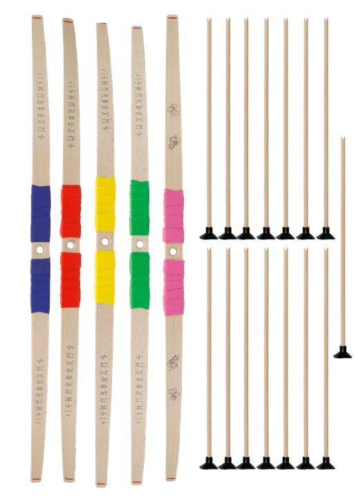Vrolijk gekleurde houten pijl en boog met schietgat. Wordt geleverd inclusief drie (3) zuignappijlen zonder veertjes. Gebruik je het schietgat niet? Dan kun je ook pijltjes met veren afschieten Lees meer