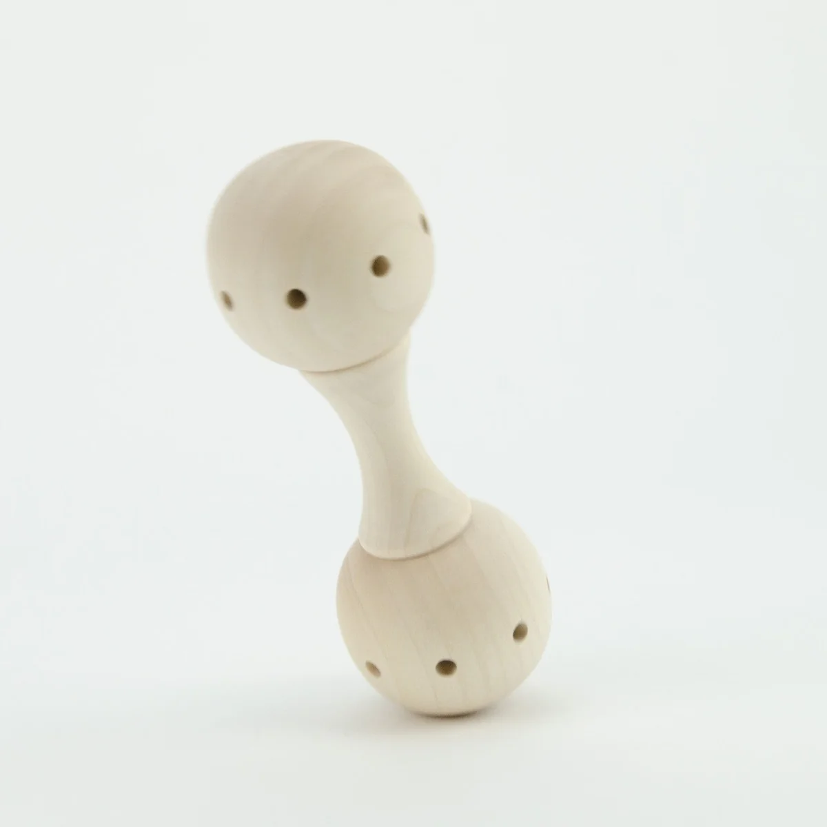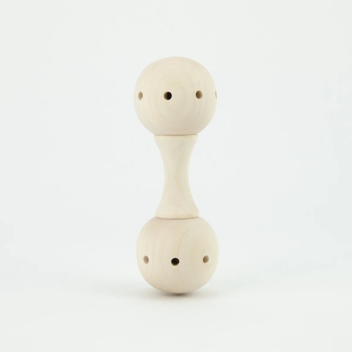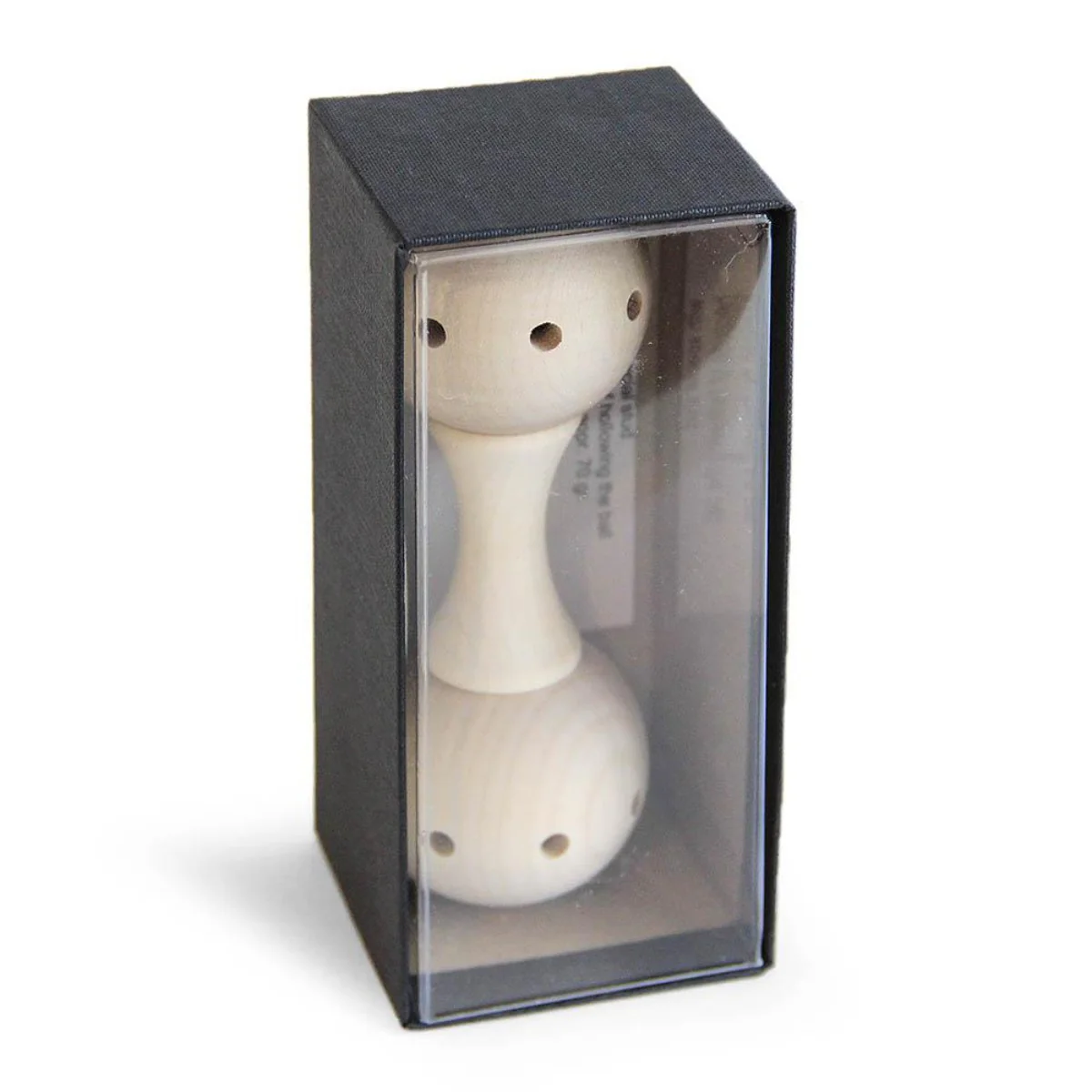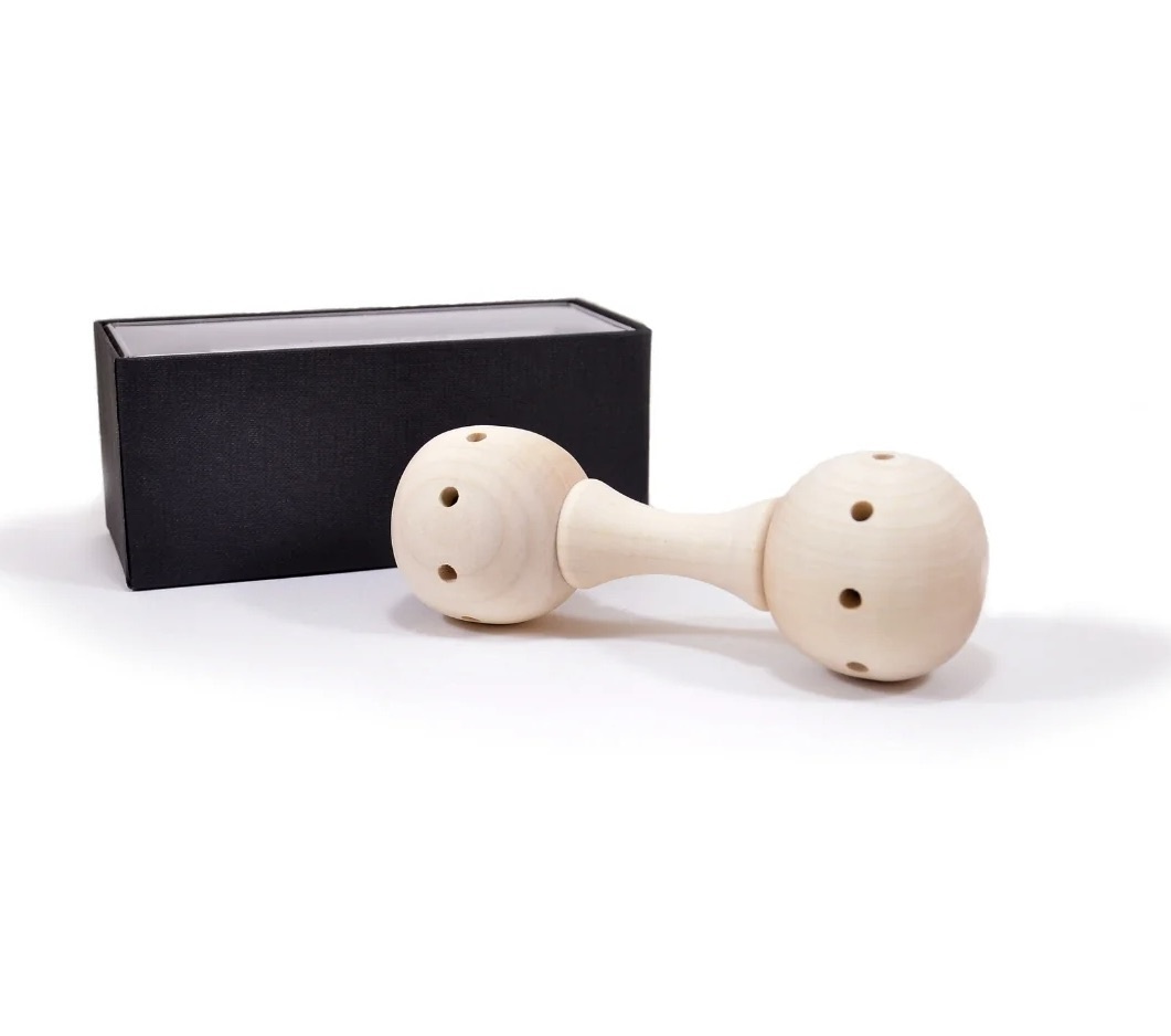 Klaus Mader heeft het gewicht weten te reduceren tot slechts 70 gram door een speciale draaitechniek toe te passen waarbij beide uiteinden zijn gevuld met kleine belletjes. En als je de rammelaar over de grond laat rollen, is het ook een bijzonder speeltje!