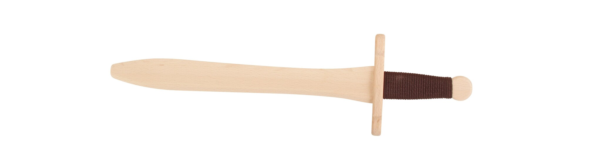 Dit prachtige, kleine houten zwaard is gemaakt van massief beukenhout en is zeer stevig voor allerlei ridder- of piratengevechten. Het zwaard is 48 cm lang en ligt dankzij de katoenen gevlochten linnen wikkeling van het handvat bijzonder goed in de hand.