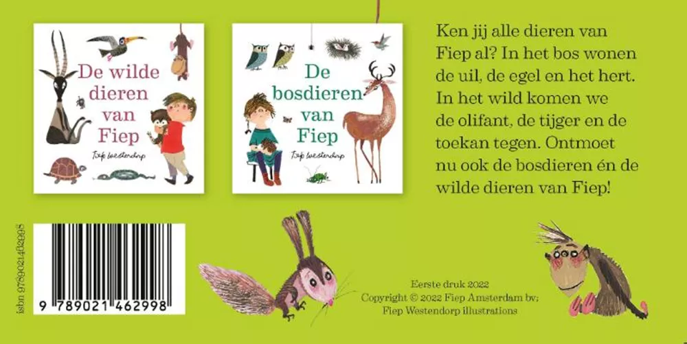 Allemaal kennen we ze: Pim en Pom, Siepie en Takkie, Dollie en Karel met de houten poot, het hondje Smeerkees… maar Fiep tekende nog veel meer dieren. In deze boekjes leren we ook de andere dieren van Fiep kennen. Van uil tot egel en ree in De bosdieren van Fiep, en van olifant tot tijger en toekan in De wilde dieren van Fiep.