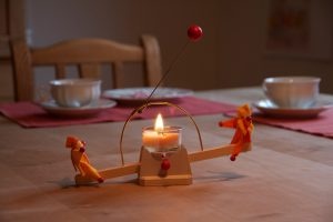 Aangedreven door een kaars kunnen de poppetjes heen en weer wiegen.