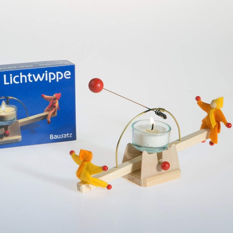 De lichtwip wordt aangestuurd door een waxinelichtje.De "motor" is een bimetalen veer.Zolang de vlam brandt, wiegen de poppen in een rustig ritme heen en weer.De set is snel in elkaar gezet, waarna je heerlijk kunt ontspannen in het kaarslicht. Een speeltje voor volwassenen en kinderen om naar te kijken, maar geen speelgoed voor kindervingers. Natuurlijk kunnen kinderen vanaf een jaar of acht dit leuke experimentje wel samen in elkaar zetten