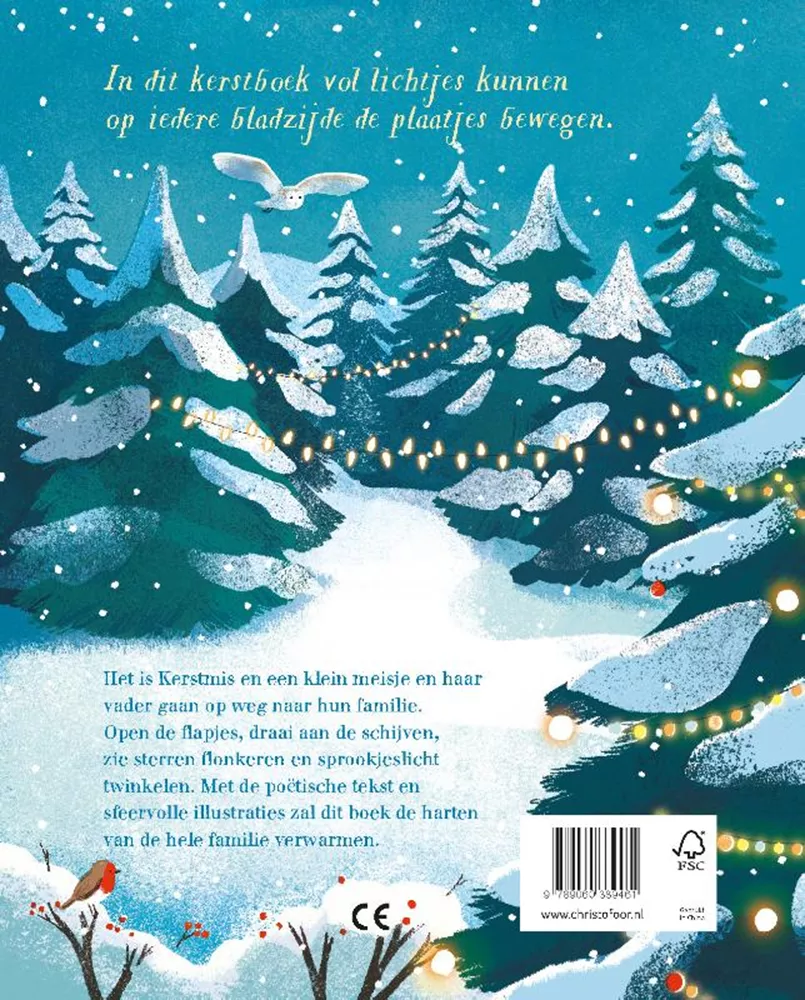 De koplampen van de auto, het noorderlicht aan de hemel en de lichtjes in de boom: ze bewegen echt door flapjes te openen of aan wieltjes te draaien! Een heerlijk kijk- en voorleesboek met lieve, sfeervolle illustraties. De bewegende elementen lijken de lichtjes echt te doen fonkelen. Een boek dat je ogen laat schitteren en je hart verwarmt.