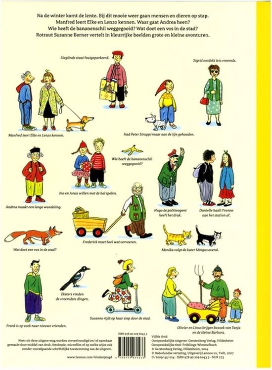 Het populaire zoekboek Leve de lente! is een tekstloos kijk- en zoekboek van de bekende Duitse auteur en illustrator Rotraut Susanne Berner. Dit prachtige prentenboek maakt deel uit van een geliefde serie rondom de seizoenen en biedt een levendige, panoramische kijk op het dagelijks leven in een drukke stad tijdens het voorjaar.