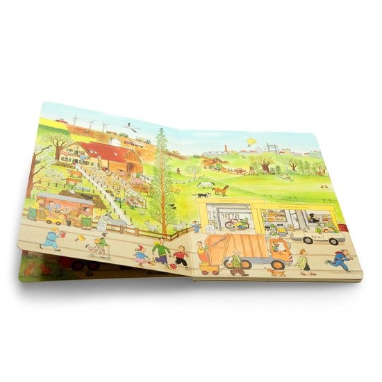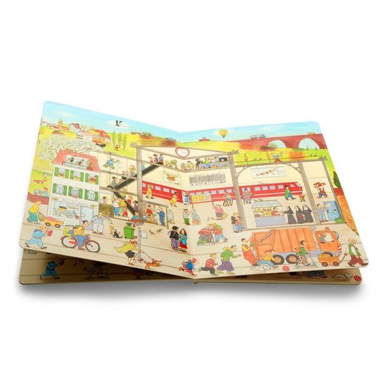 De gedetailleerde zoekplaten met herkenbare locaties zoals een boerderij, het station, een park en de stad heeft een doorlopende verhaallijnen: tientallen personages keren op elke pagina terug, waardoor kinderen hun avonturen kunnen volgen.