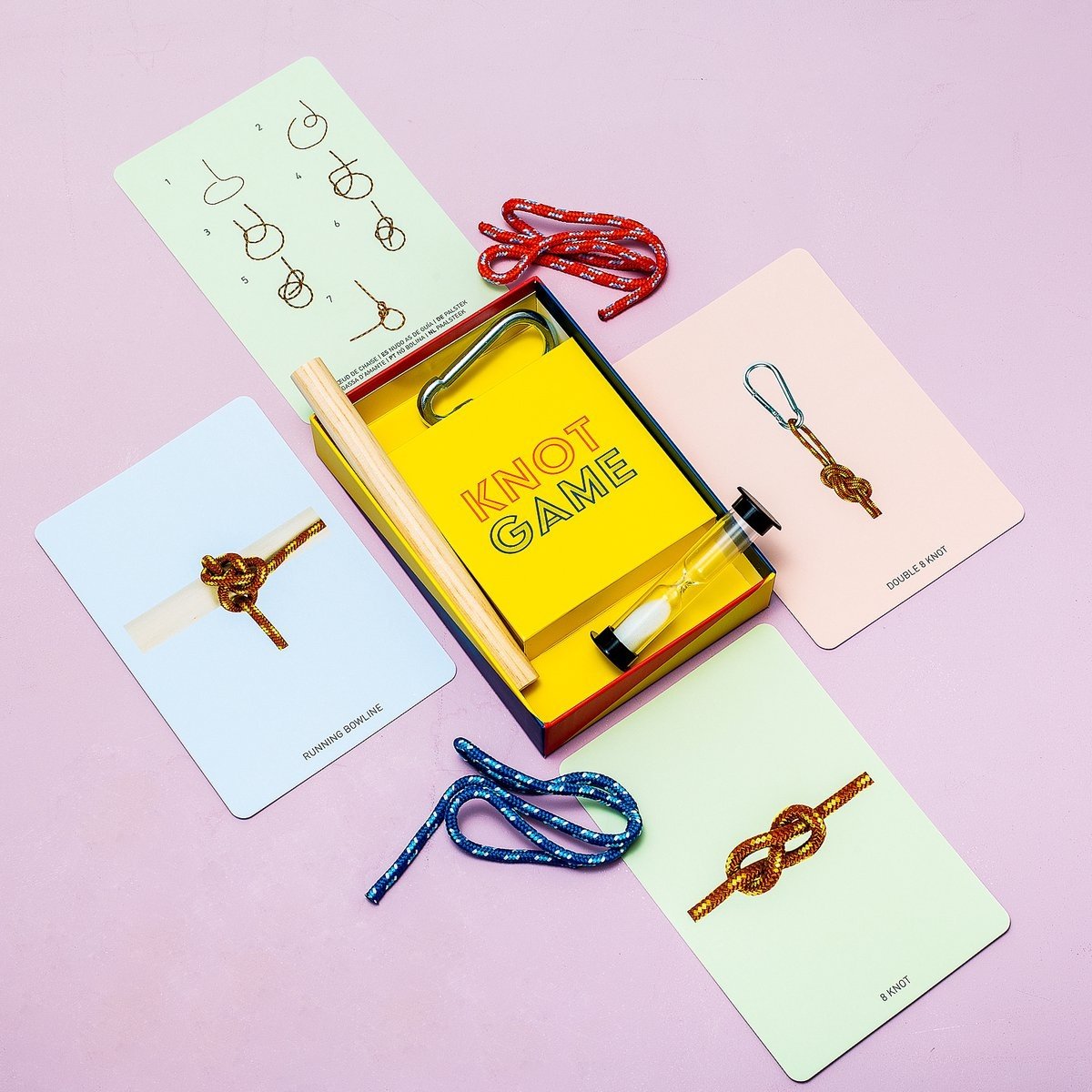 Het doosje bevat alles wat je nodig hebt: twee stukken touw, een karabijnhaak, een stokje, een zandloper en kaarten met duidelijke instructies en de namen van de knopen. Dit educatieve knopen spel is niet alleen leuk, maar ook leerzaam, en geschikt voor kinderen vanaf 8 jaar. Ideaal voor avonturiers, scouts en iedereen die zijn knoopvaardigheden wil verbeteren.