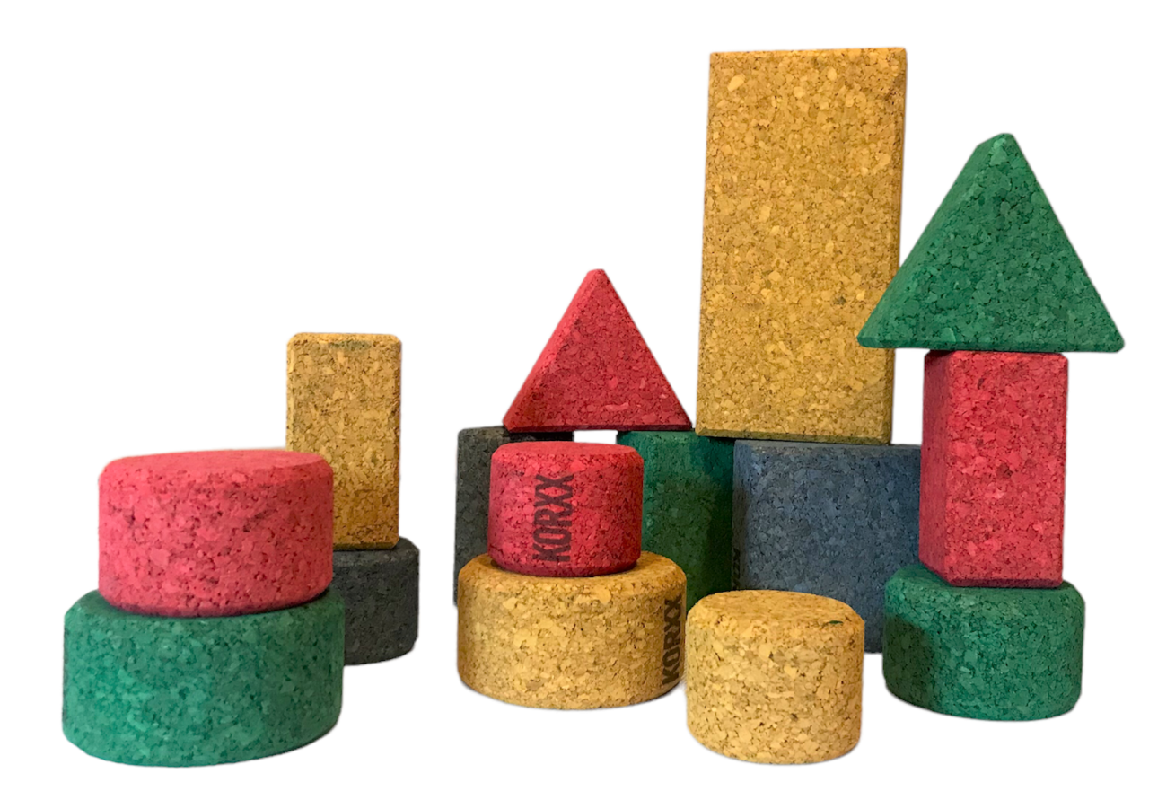 Licht, zacht, stil en stabiel: dit zijn de minimalistische bouwstenen van KORXX. Ze bestaan uit 100% geperst kurkgranulaat, dat wordt geproduceerd uit hernieuwbaar hout in duurzame bosbouw. Dankzij het speciale oppervlak hechten de blokken uitstekend aan elkaar en maken zo stabiele constructies mogelijk zonder te verschuiven. Het vrij creëren van structuren bevordert de creativiteit en verbeeldingskracht en schept zelfvertrouwen door positieve succeservaringen. De KORXX bouwstenen zijn anti-allergeen en vormen door hun gewicht een lager risico op blessures, waardoor zelfs de kleinste kinderen vanaf twee jaar ermee kunnen spelen.