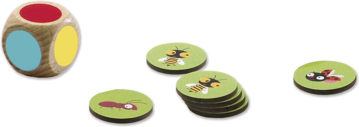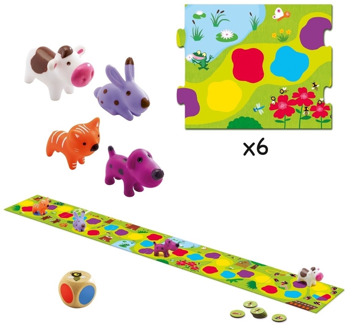1 speelbord van 1 meter lang (6 puzzelstukken) 4 diertjes: poes, hond (7cm), konijn en koe, 1 dobbelsteen met kleuren, 15 fiches