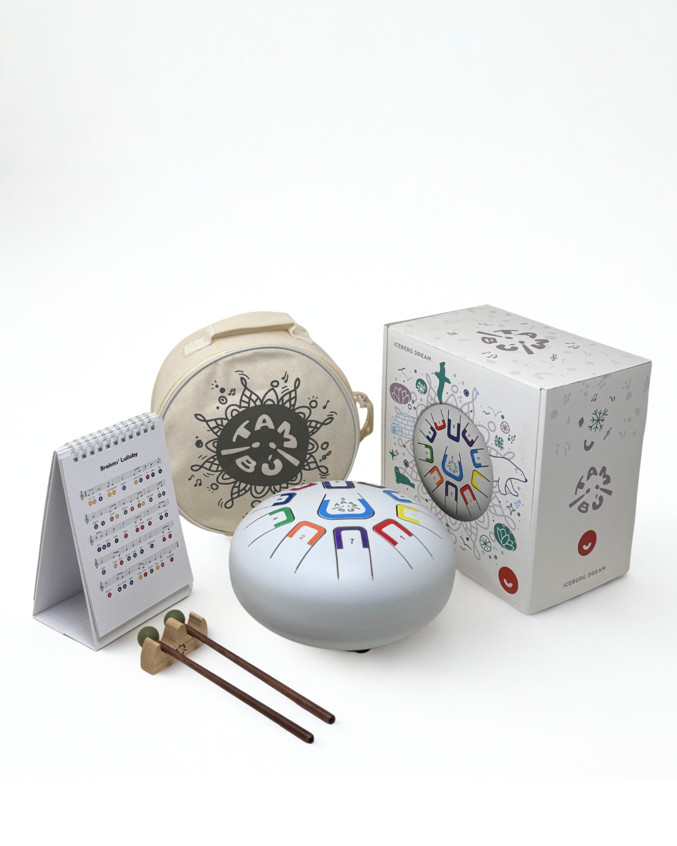De set bevat: 1x matwitte TAMBU | 1x muziekboek | 2x drumstokjes | 1x drumstokjeshouder | 4x vingerplectrum