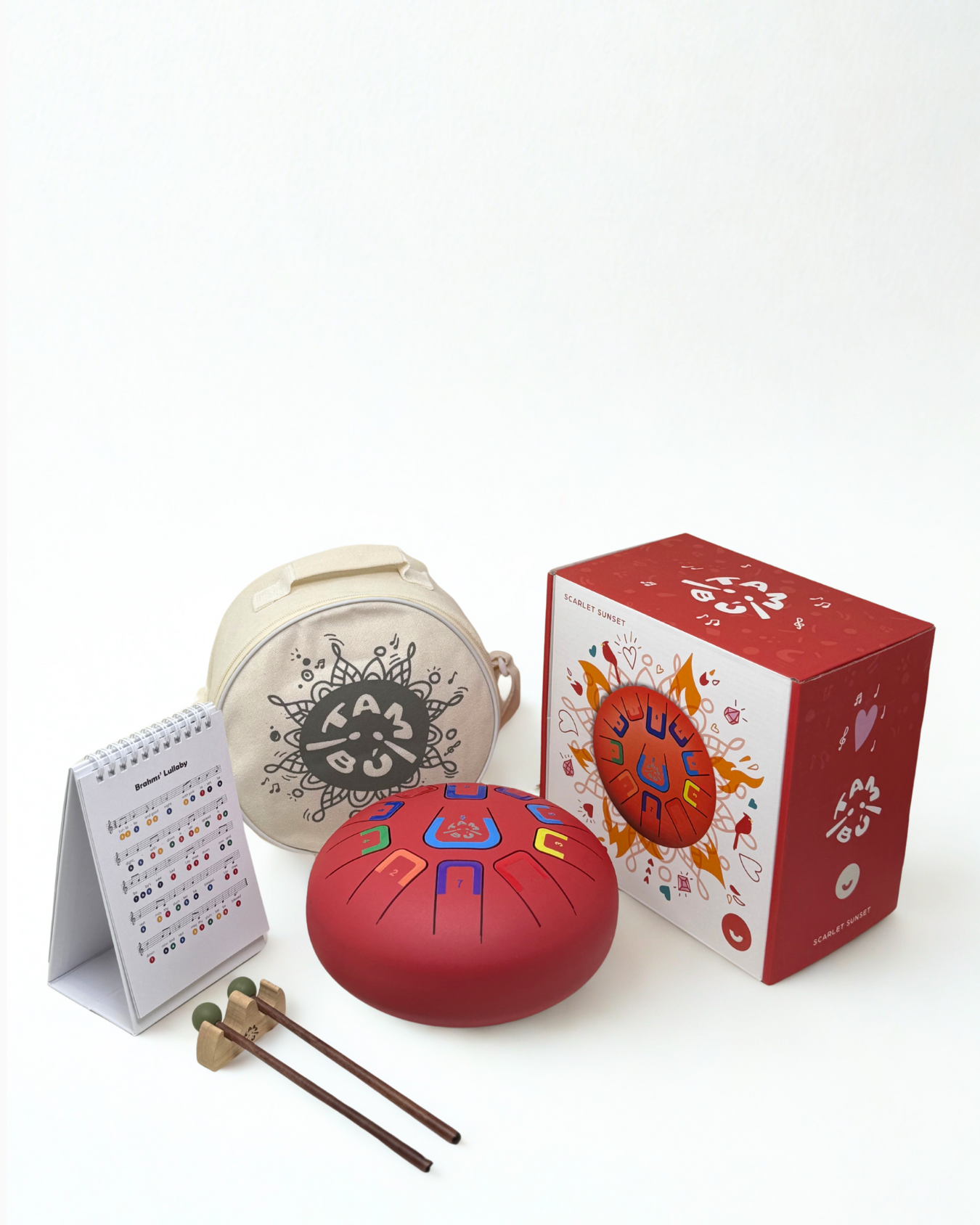 De set bevat: 1x rode TAMBU | 1x muziekboek | 2x drumstokjes | 1x drumstokjeshouder | 4x vingerplectrum