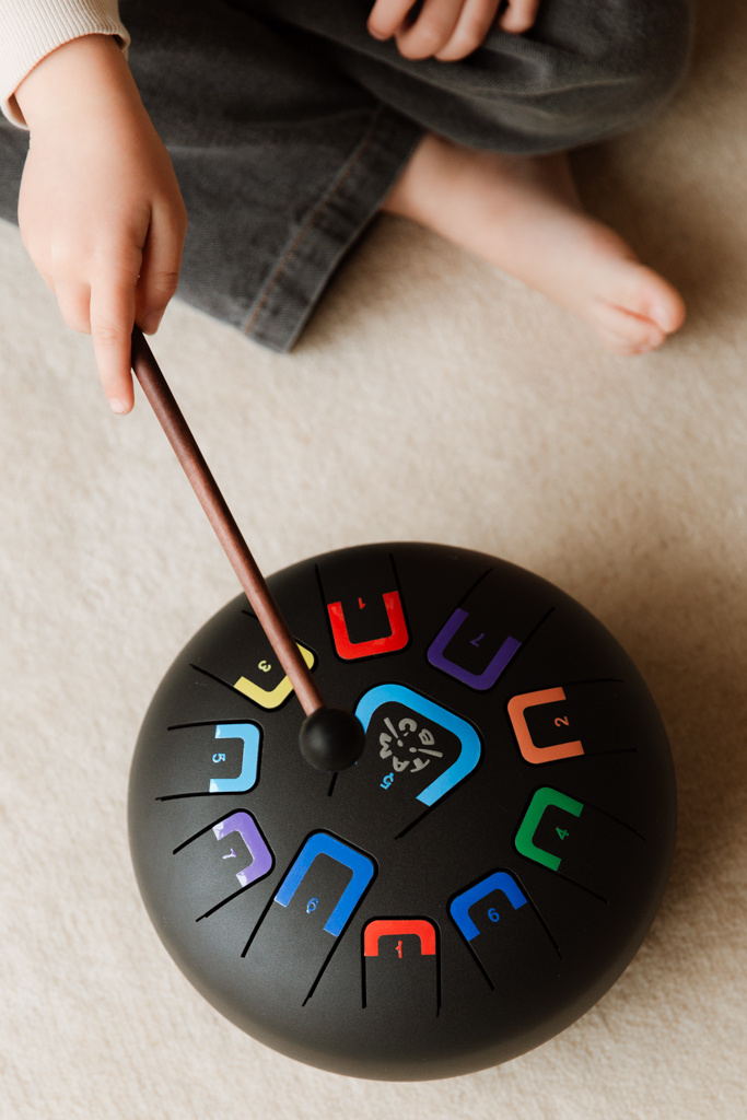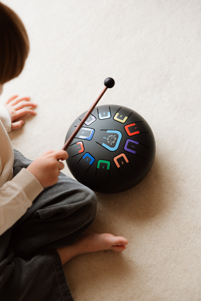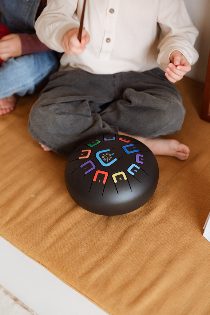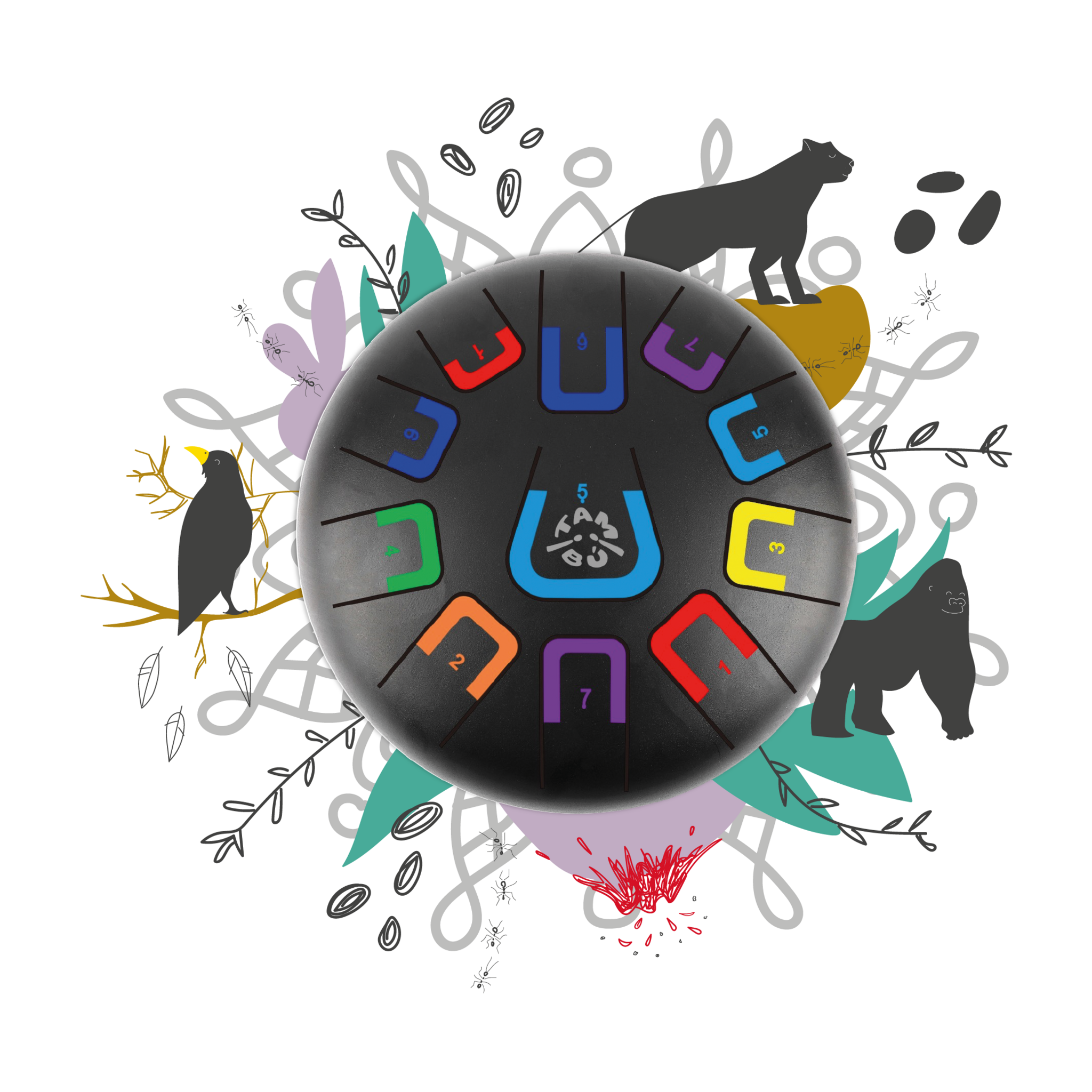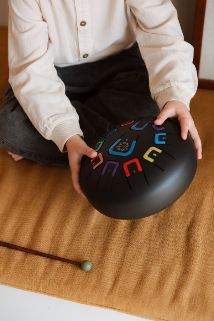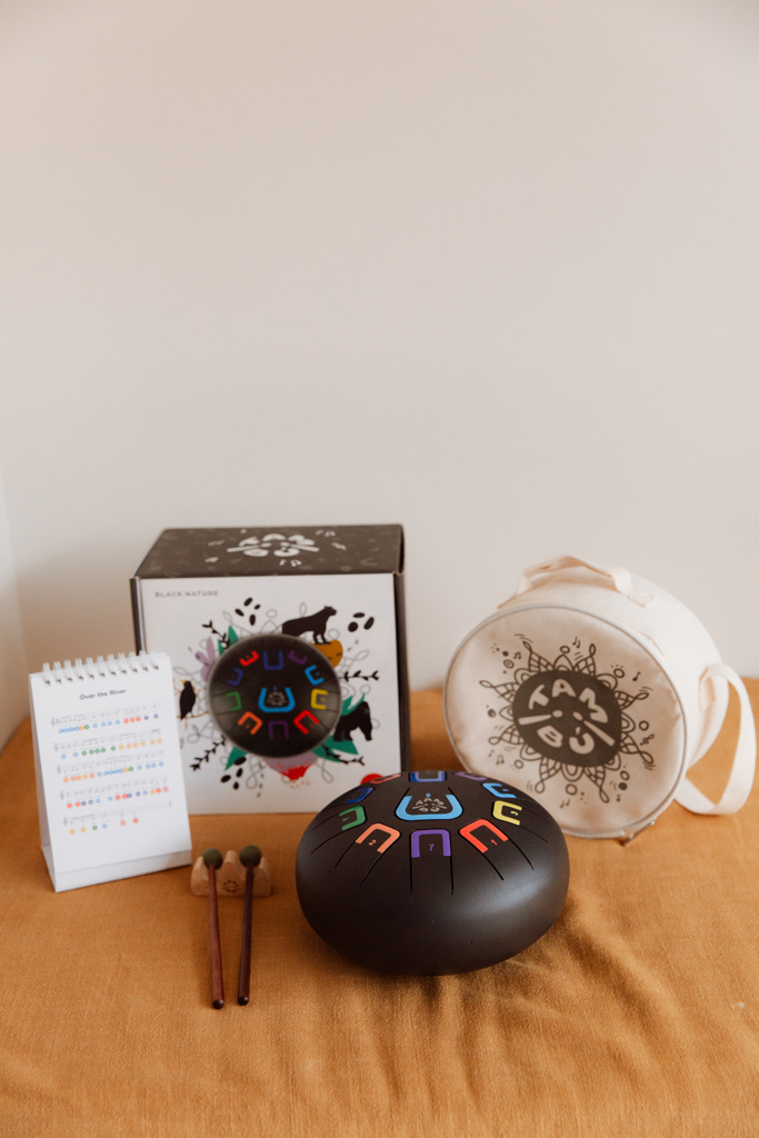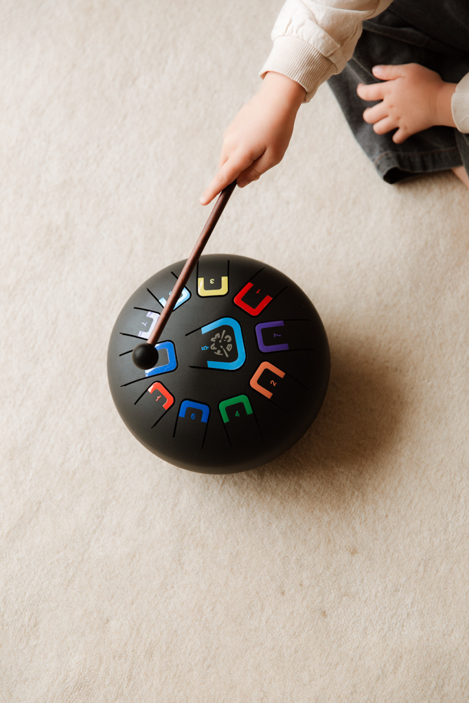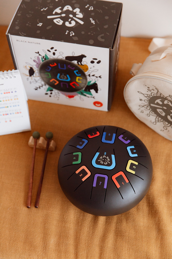 De Steel Tongue Drum is een waardevol muziekinstrument dat je laat kennismaken met de fascinerende wereld van percussie. Deze tongdrum is een soort trommel op verschillende manieren te bespelen. TAMBÚ produceert een verscheidenheid aan tonen die harmonieus op elkaar zijn afgestemd om een langdurig, rustgevend geluid te creëren. Hierdoor ontstaat een omhullende en uiterst ontspannen sfeer. Met de 11 tonen kun je geavanceerde partituren reproduceren en componeren. Elke noot is gemarkeerd met een kleur en een nummer.
