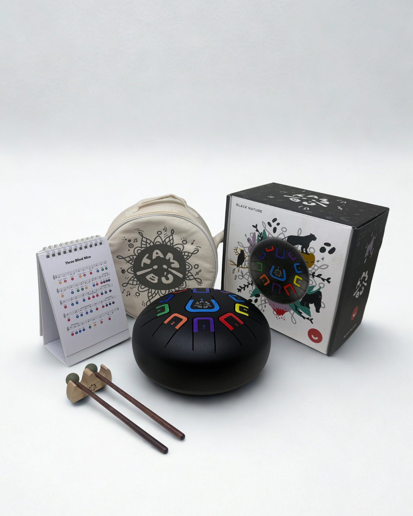 De zwarte TAMBU is een betoverend muzikaal speeltje dat de perfecte introductie biedt tot de fascinerende wereld van percussie. Het fluweelzachte geluid maakt de tongdrum dus ook geschikt voor meditatie- en ontspanningsworkshops.