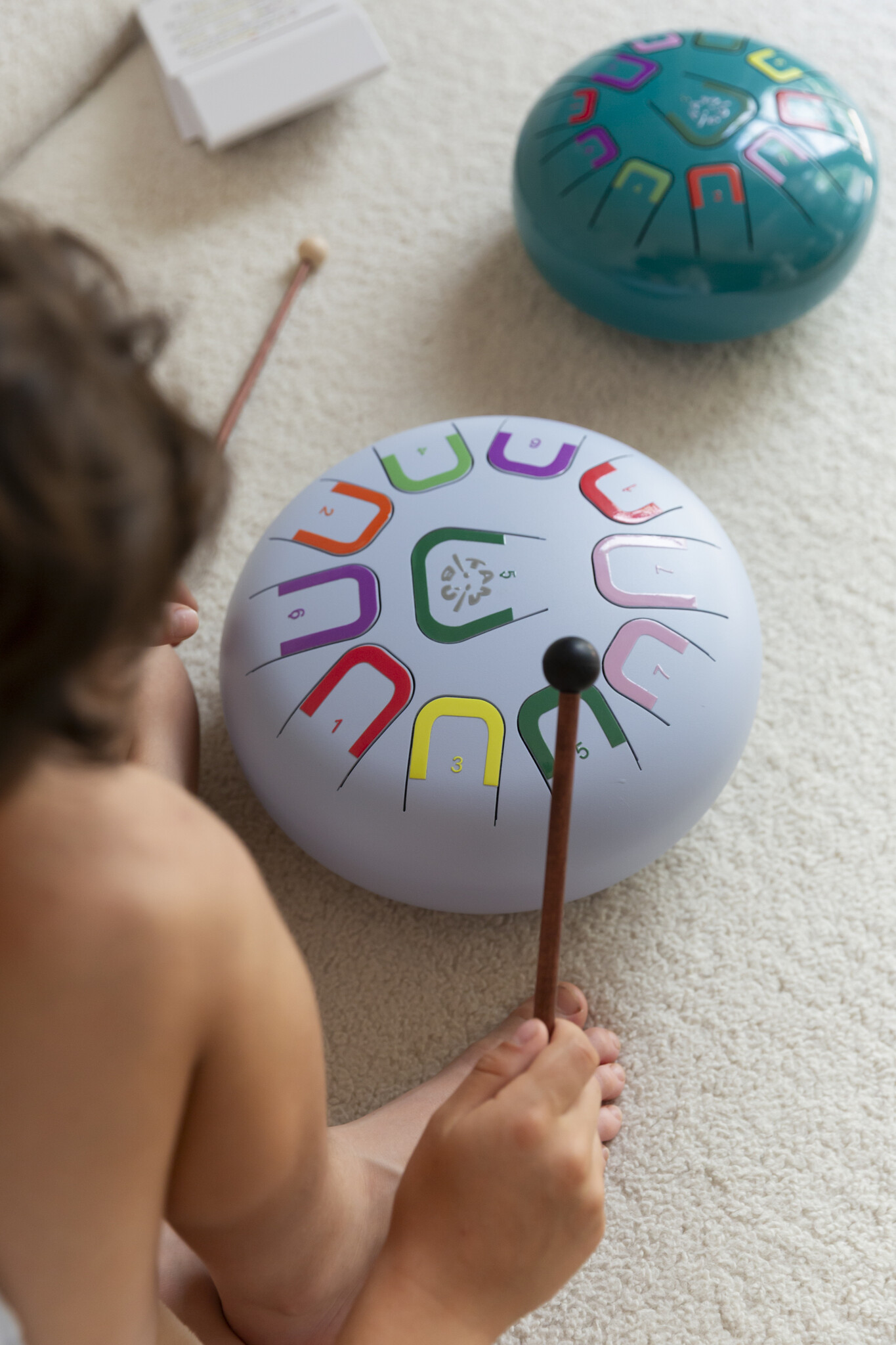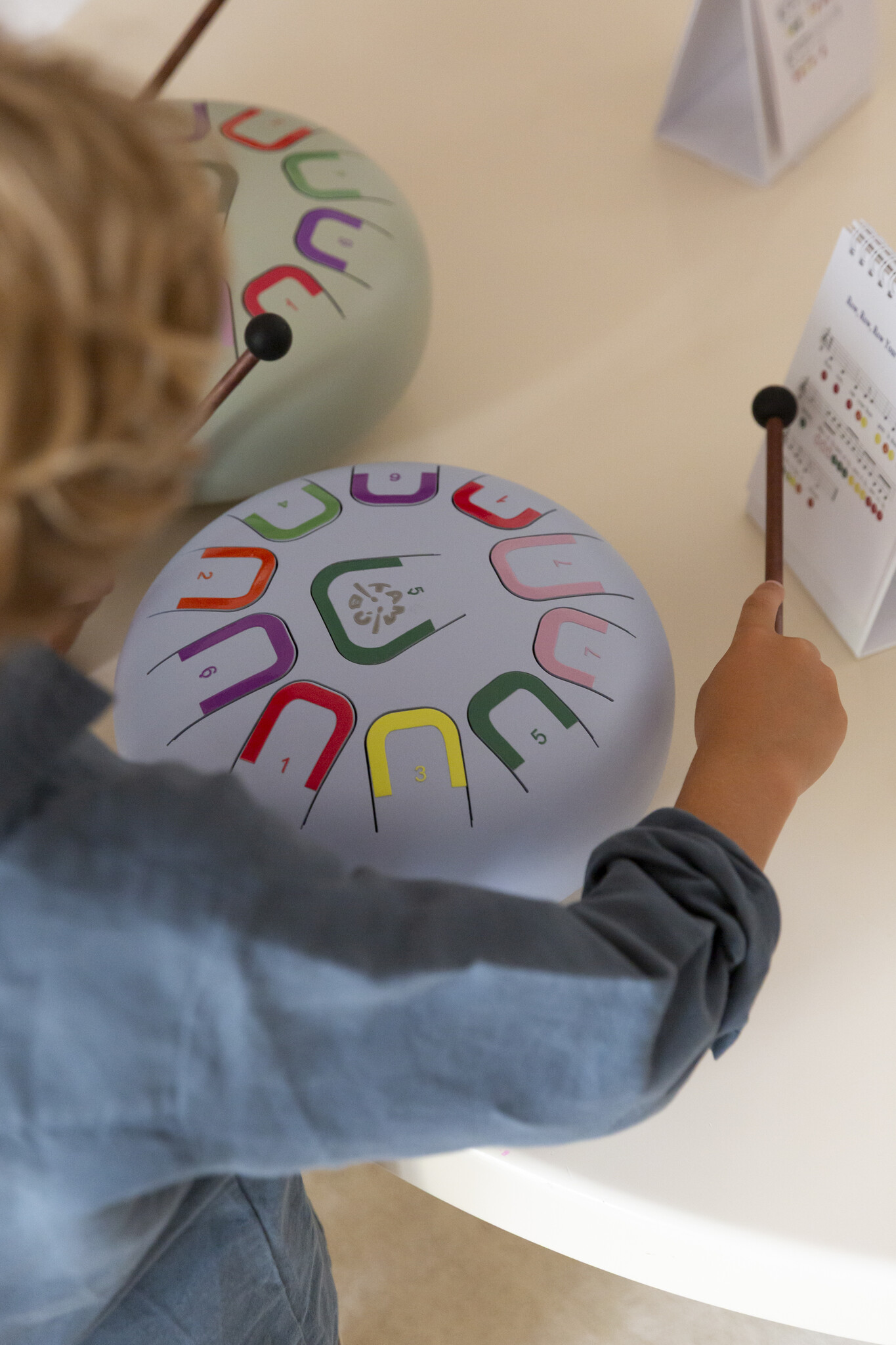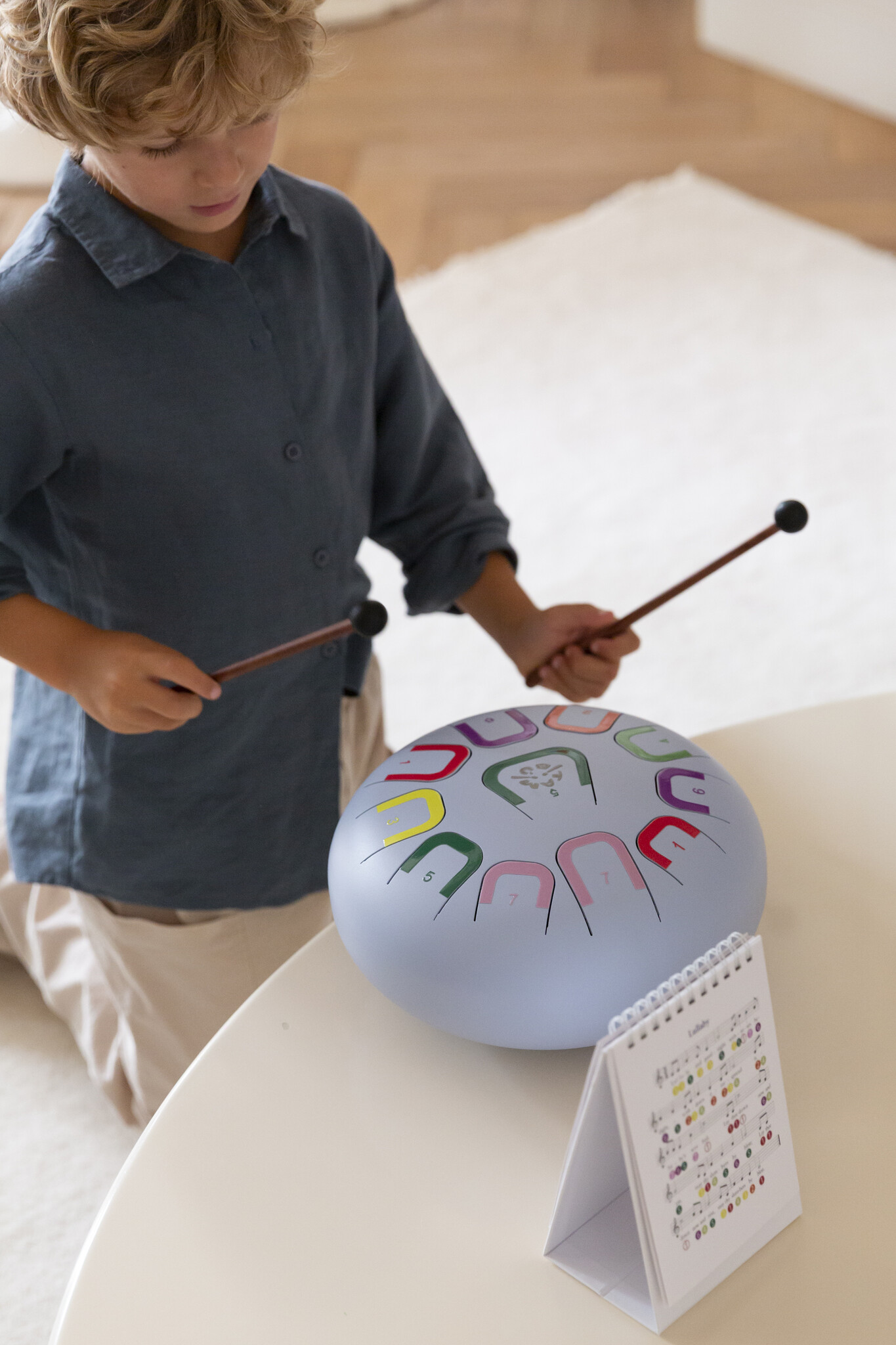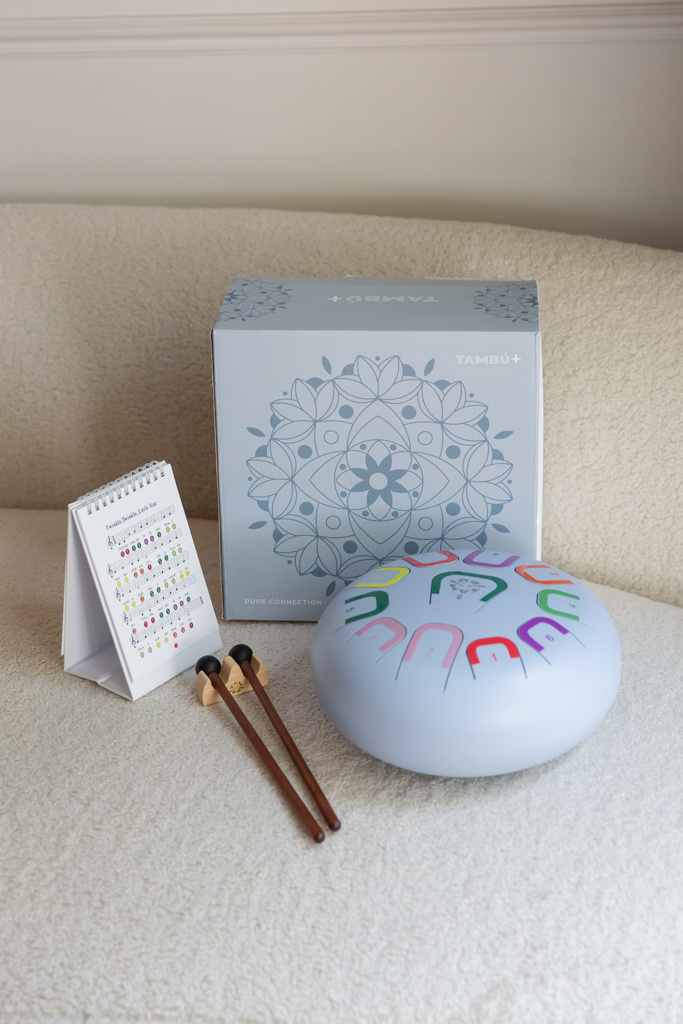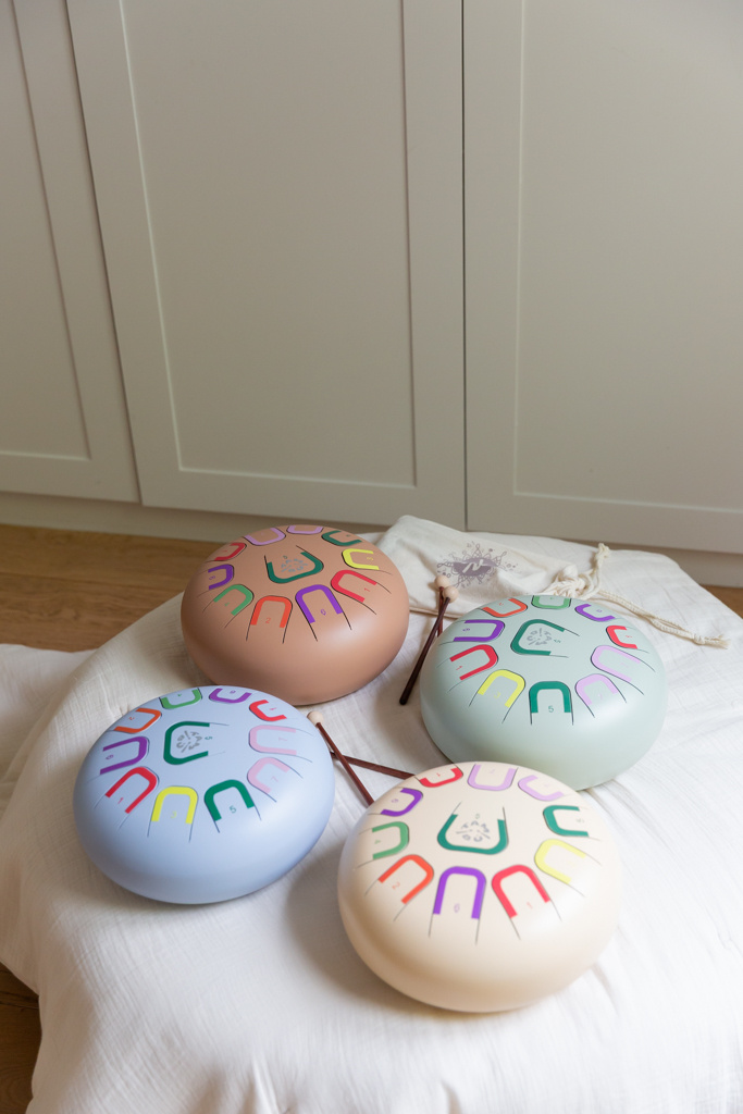 Er zijn in totaal 11 tonen met elk een eigen kleur. Inbegrepen is een aantrekkelijke draagtas en een muziekboekje dat zowel cijfers als kleuren gebruikt. De TAMBÚ produceert een verscheidenheid aan tonen die harmonieus op elkaar zijn afgestemd om een langdurig, rustgevend geluid te creëren. Hierdoor ontstaat een omhullende en uiterst ontspannen sfeer. Met de 11 tonen kun je geavanceerde partituren reproduceren en componeren. Elke noot is gemarkeerd met een kleur en een nummer. Daardoor is de Tambu juist ook geschikt om te leren muziek maken.