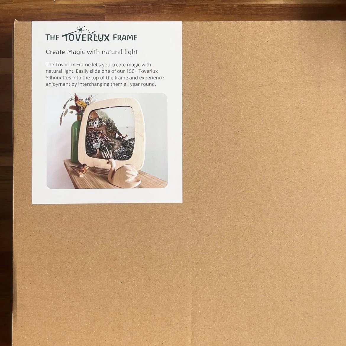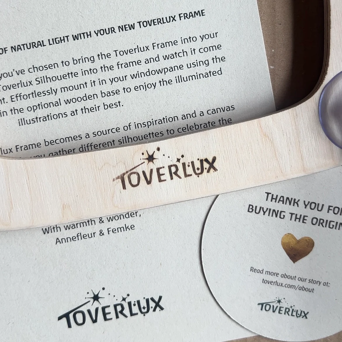 Zet het frame neer in het houdertje dat je los kunt kopen of hang je Toverlux houten frame voor silhouetten aan het raam met de bijgeleverde zuignap. Zo filtert het licht mooi door je silhouet en verwarmt de kamer met een toverachtig licht.