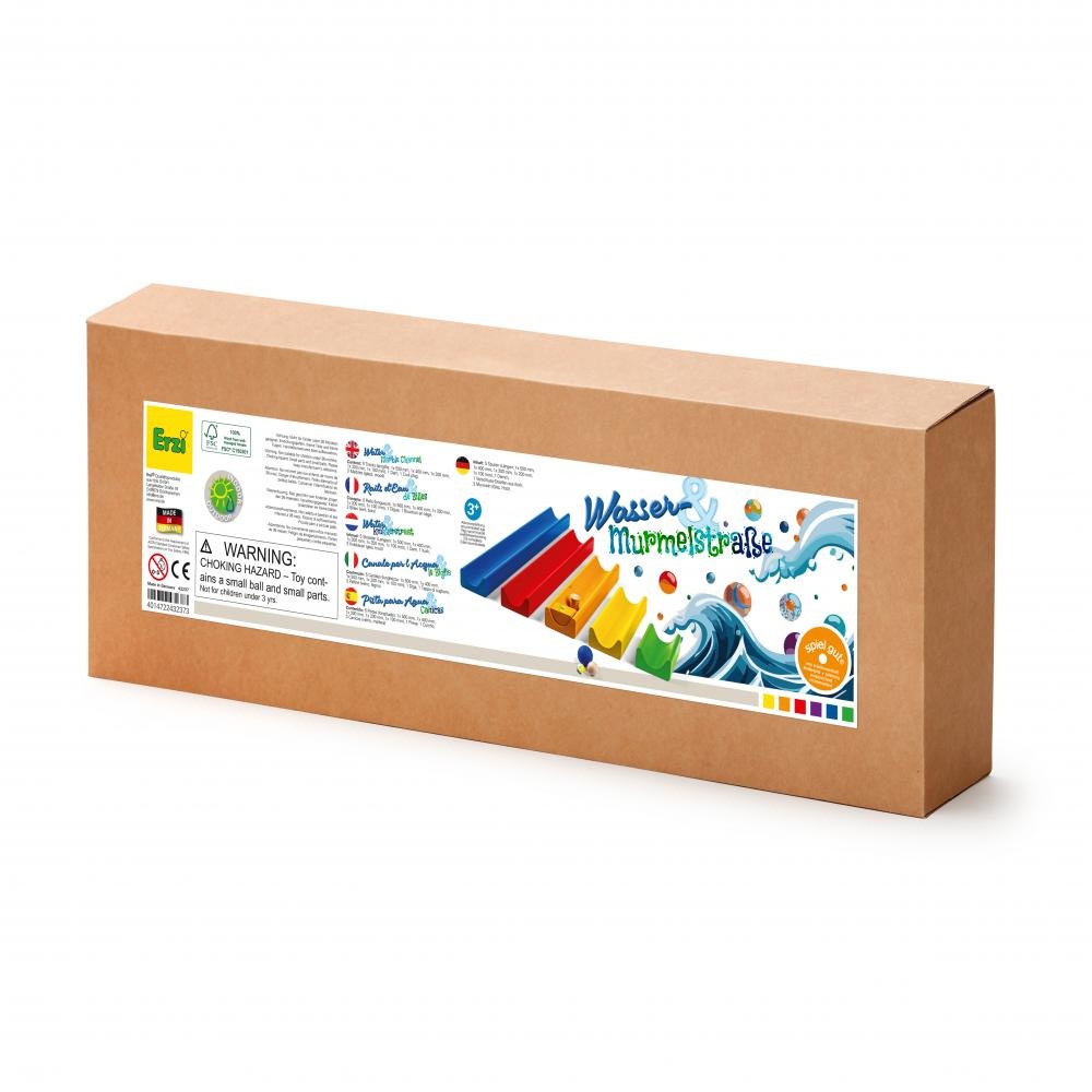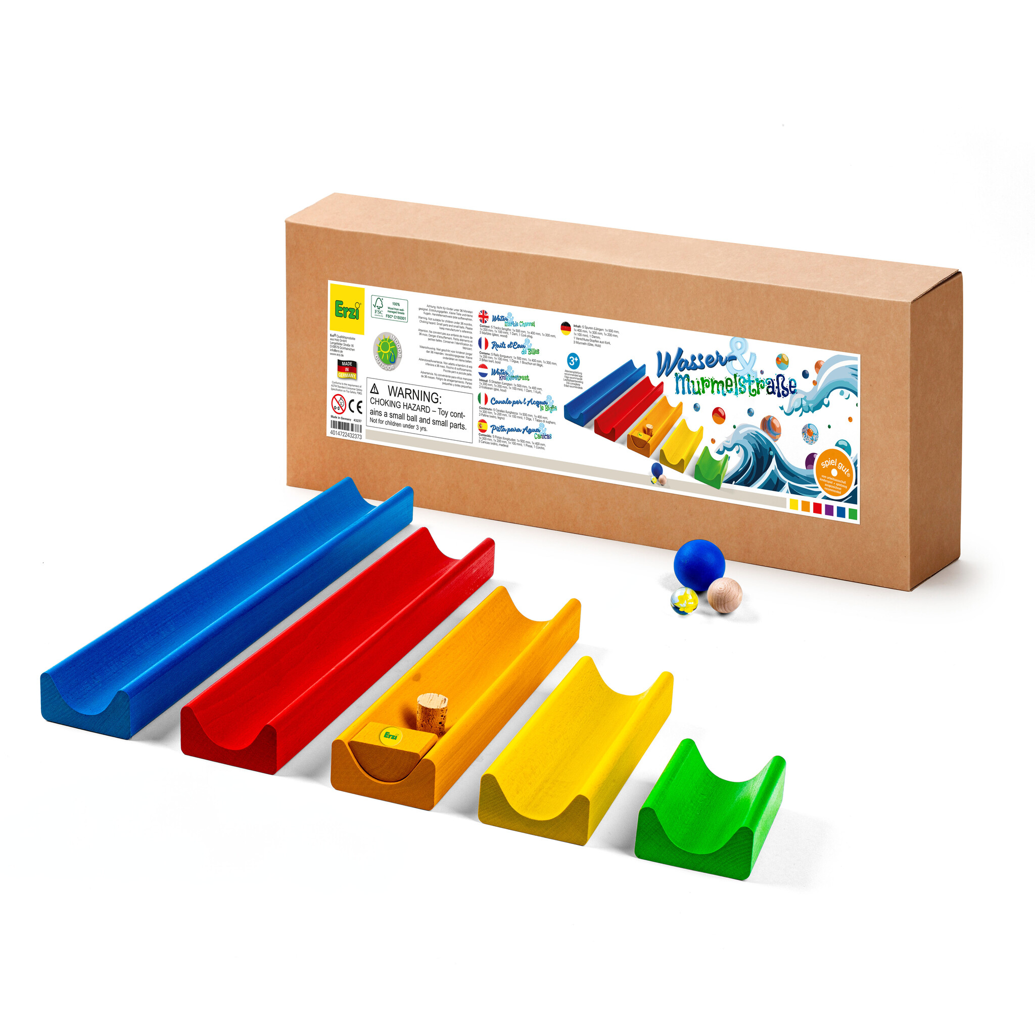 De Erzi water- en knikkerbaan bevat 5 houten banen, 1 kurken stop, en 3 houten varianten knikkers. De knikkerbaan heeft tevens het Duitse Spielgut label, een keurmerk voor veilig en verantwoord speelgoed.