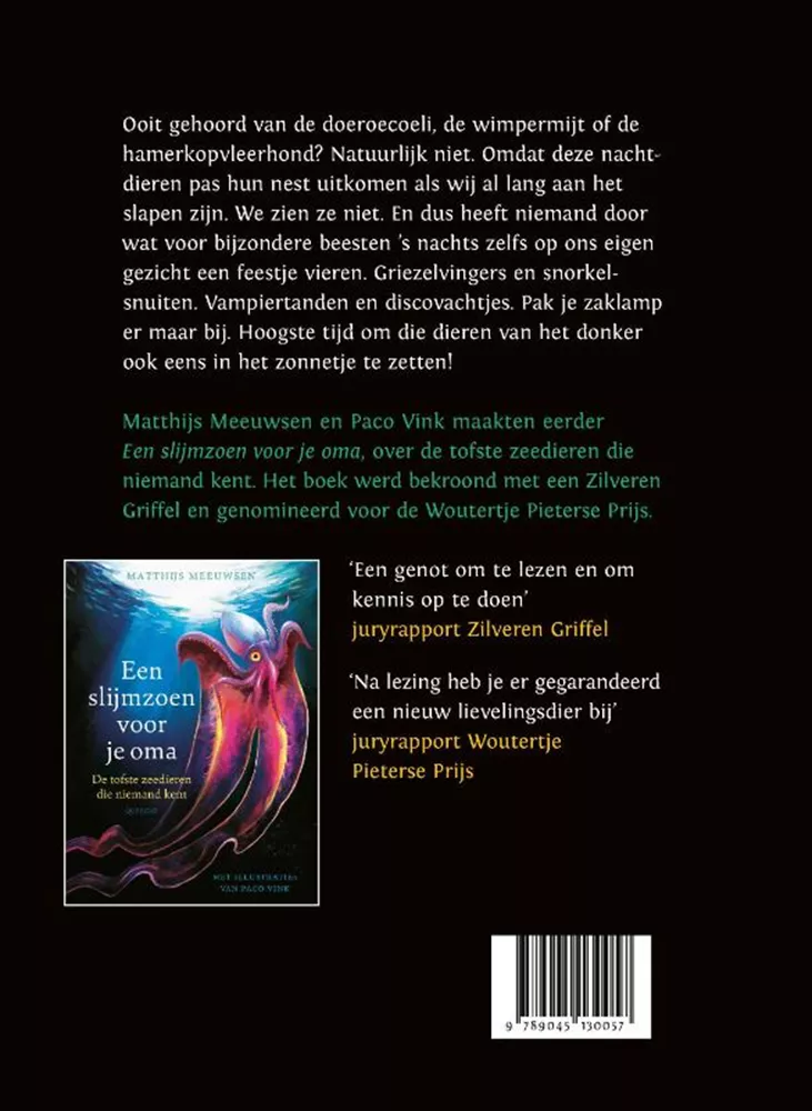 Griezelvingers en snorkelsnuiten. Vampiertanden en discovachtjes. Pak je zaklamp er maar bij. Hoogste tijd om die dieren van het donker ook eens in het zonnetje te zetten! Met pakkende portretten van de reuzenbekhaai, de colocolo, de goudmol, het waterdwerghert en nog veel meer unieke nachtdieren die iedereen zou moeten kennen.