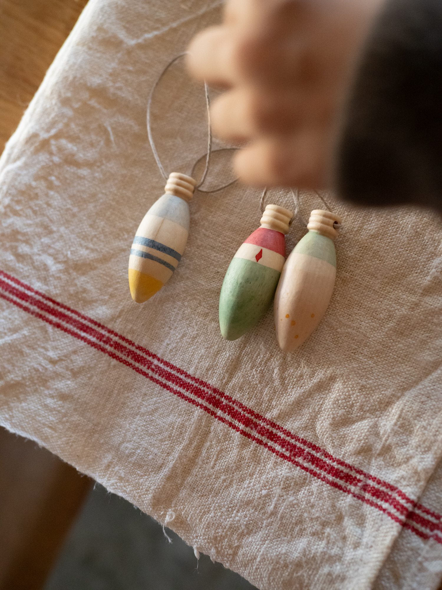 Dit doosje bevat 3 lampvormige houten ornamenten inclusief ophangdraad, met de hand beschilderd.